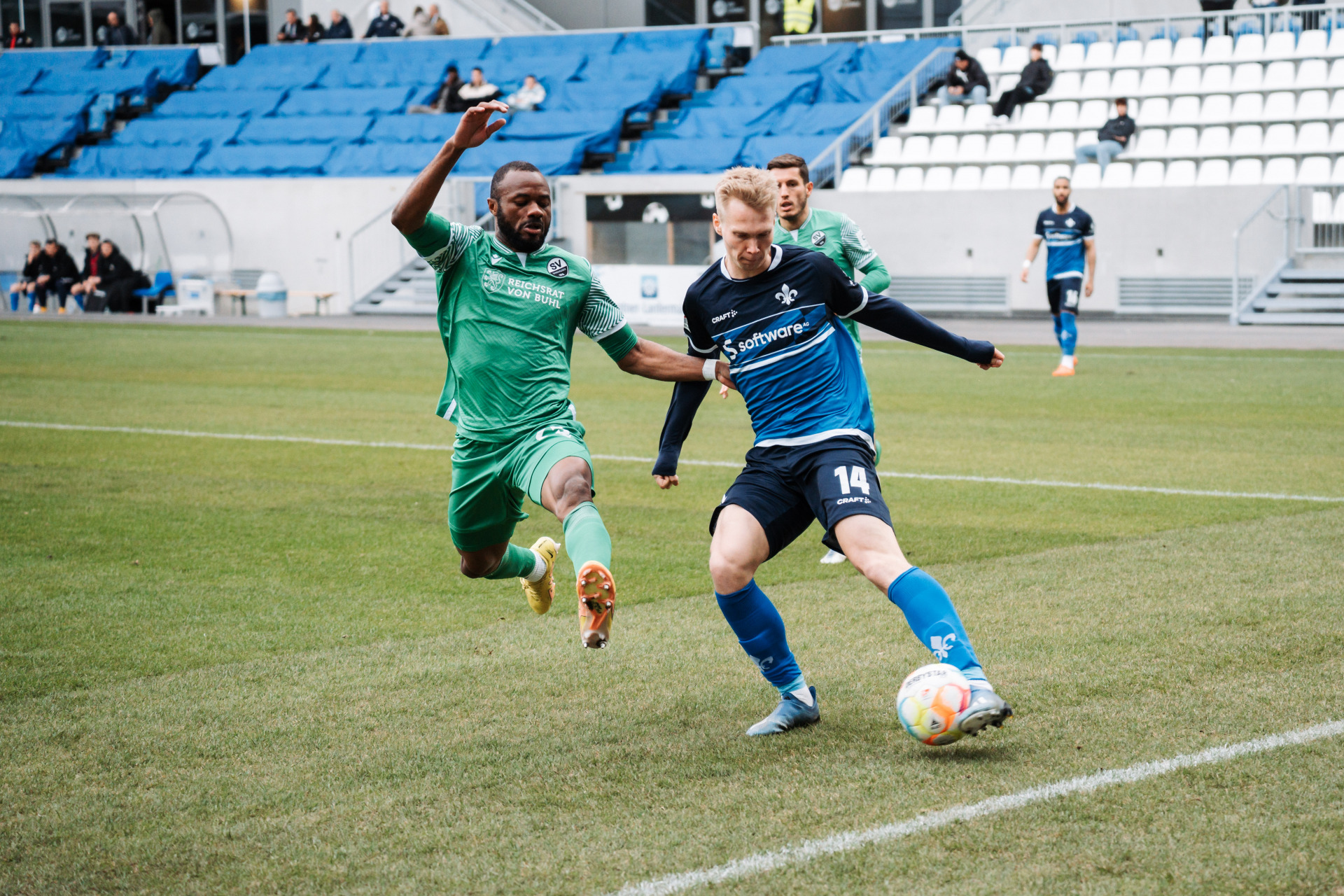 Raus aus den Katakomben, rein ins Merck-Stadion am Böllenfalltor: Im Testspiel gegen den SV Sandhausen liefen beide Mannschaften erstmals aus dem Spielertunnel der neuen Haupttribüne auf den Rasen. Und es dauerte keine sieben Zeigerumdrehungen, ehe sich die Lilien gefährlich vor dem gegnerischen Kasten zeigten. Doch einen Abschluss von Frank Ronstadt konnte Zhirov vor der Linie entschärfen. Bis zur nächsten Lilien-Möglichkeit mussten sich die insgesamt 815 Zuschauer am Bölle dann bis zur 28. Minute gedulden: Nach schöner Kombination war es Oscar Vilhelmsson, der letztlich doch deutlich über den Kasten schoss. Insgesamt legten beiden Mannschaften im Verlauf der ersten Halbzeit eine gute Intensität an den Tag, weshalb sich ein munteres Testspiel entwickelte – auch wenn Großchancen bis zum Pausenpfiff dabei nicht herausspringen sollten.