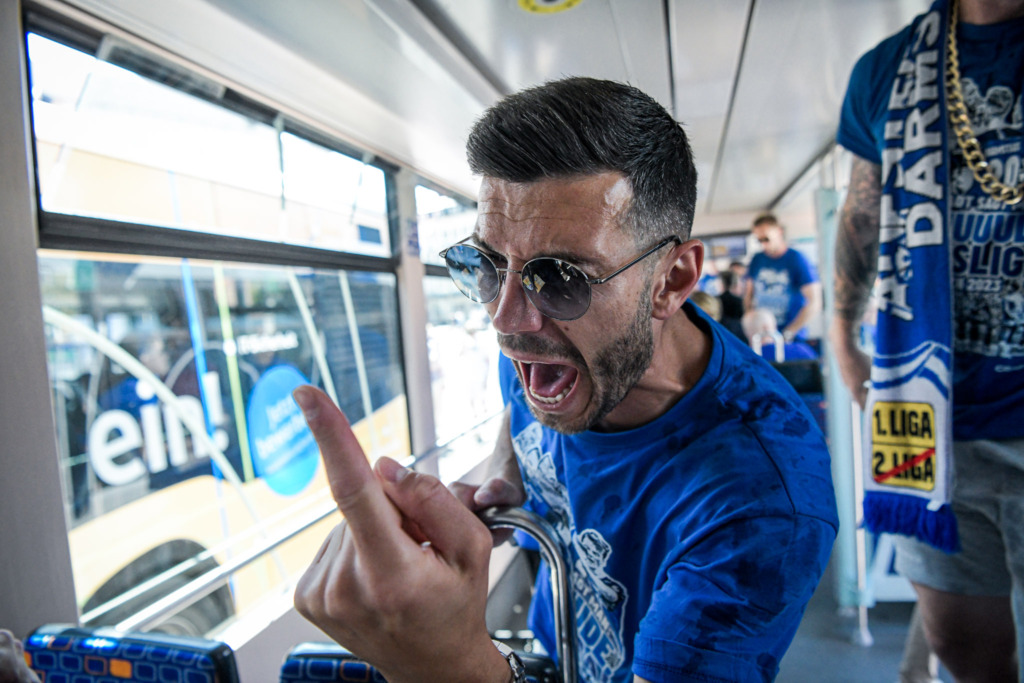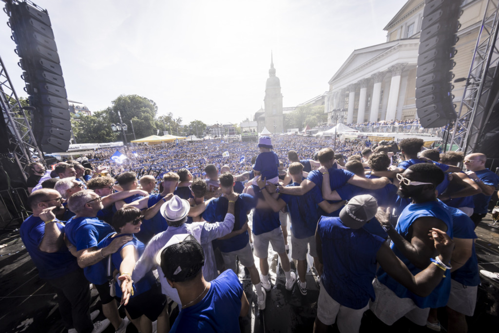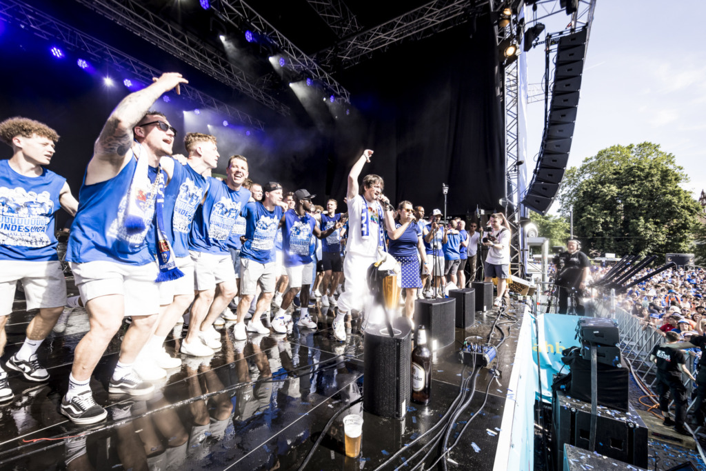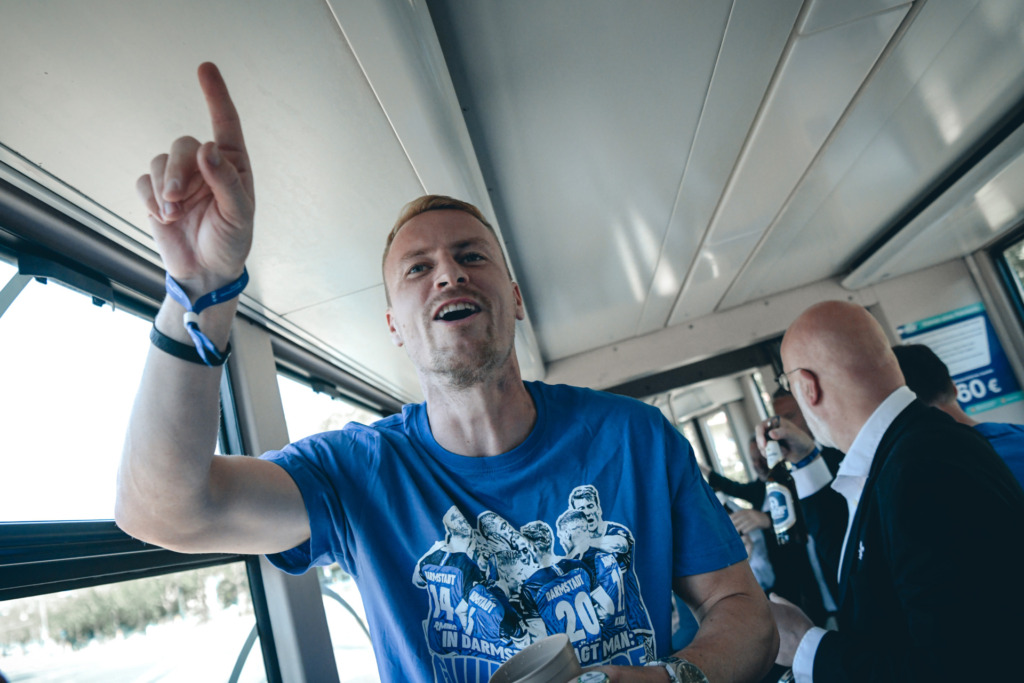 Die Highlights im Mai, sie sollen aber nicht weniger werden. Schließlich steht die große „Uffstieschs“-Party noch aus – Pfingstmontag, Karolinenplatz. Und wir können uns nur wiederholen: Was für ein Tag. Schon auf der Fahrt vom Böllenfalltor in die Innenstadt mit der Lilien-Straßenbahn von HEAG mobilo im 125-Jahre-Design startet die Aufsteigermannschaft in den blau-weißen Partymarathon. In der Darmstädter City angekommen, geht’s ab ins Rathaus: Eintrag ins Goldene Buch der Stadt. Und dann endlich zu den Fans. Ausgelassen feiern alle Lilien zusammen den vierten Bundesliga-Aufstieg in der Vereinsgeschichte des SV Darmstadt 98. Der Mai 2023? Wohl eindeutig unser Lieblingsmonat.