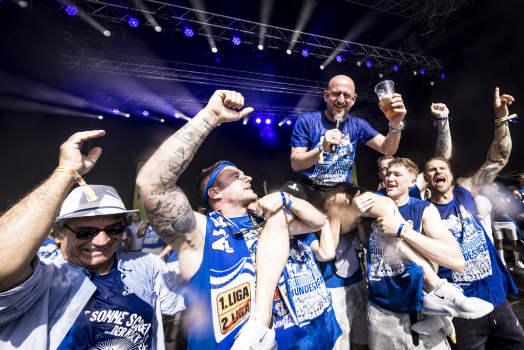 „Wir haben vier Punkte Vorsprung und es in der eigenen Hand. Natürlich wollen wir aufsteigen. Wir wollen es einfach machen“, verdeutlicht Torsten Lieberknecht auf der Pressekonferenz vor dem 33. Spieltag. Gesagt, getan. 19. Mai 2023. Der SV Darmstadt 98 schafft wirklich die Sensation. Als um 20.25 Uhr der Abpfiff des Schiedsrichters ertönt, gibt es im Merck-Stadion am Böllenfalltor kein Halten mehr. Nach dem 1:0-Sieg gegen den 1. FC Magdeburg kehren die Lilien zum vierten Mal ins deutsche Fußball-Oberhaus zurück. Der Abpfiff des Spiels ist gleichzeitig der Anpfiff einer blau-weißen Partynacht. Platzsturm. Freudentränen. Jubeltrauben. Bierduschen.
