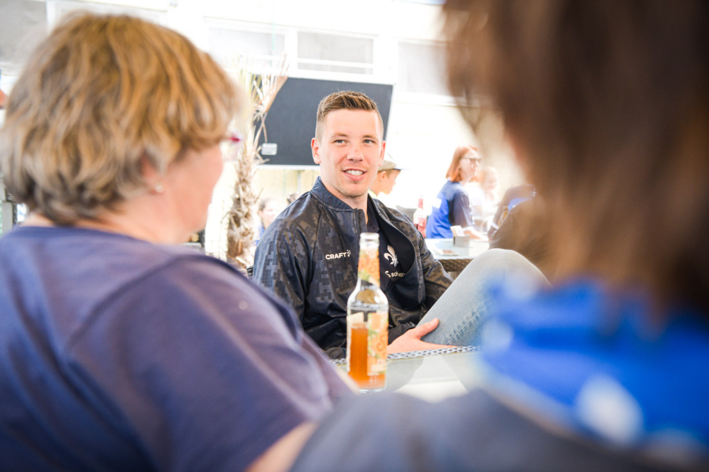 Nach getaner Arbeit und als Dankeschön für ihren tollen Einsatz lud Krombacher alle Teilnehmenden zum gemeinsamen Essen in die Lilienschänke ein. Als besonderer Höhepunkt schauten beim Get-together auch die Lilien-Profis Mathias Honsak, Christoph Zimmermann und Alexander Brunst vorbei und nahmen sich reichlich Zeit für angeregte Gespräche sowie Foto- und Autogrammwünsche.