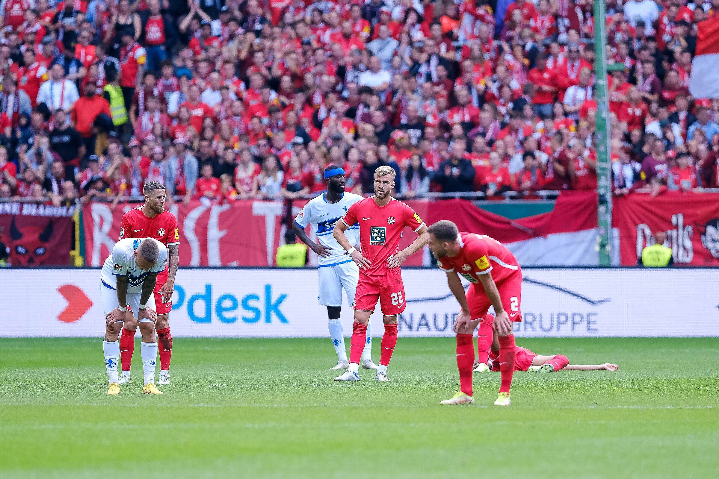 Abpfiff im Fritz-Walter-Stadion. Und ein Bild fasst diese verrückte Partie sofort zusammen: Direkt am Mittelkreis stehen Phillip Tietz und Boris Tomiak, im Hintergrund haben sich Patric Pfeiffer und Lars Bünning positioniert. Die Oberkörper der beiden vorderen Protagonisten sind gen Boden geneigt, mit ihren Armen stützen sie sich auf den Knien ab. Dahinter zwei Spieler mit aufrechtem Stand, die Arme in die Hüfte abgelegt, ihre Blicke leer. Vier Akteure, zwei unterschiedliche Mannschaften. Und trotzdem irgendwie die gleichen Gefühlslagen auf dem Spielfeld.