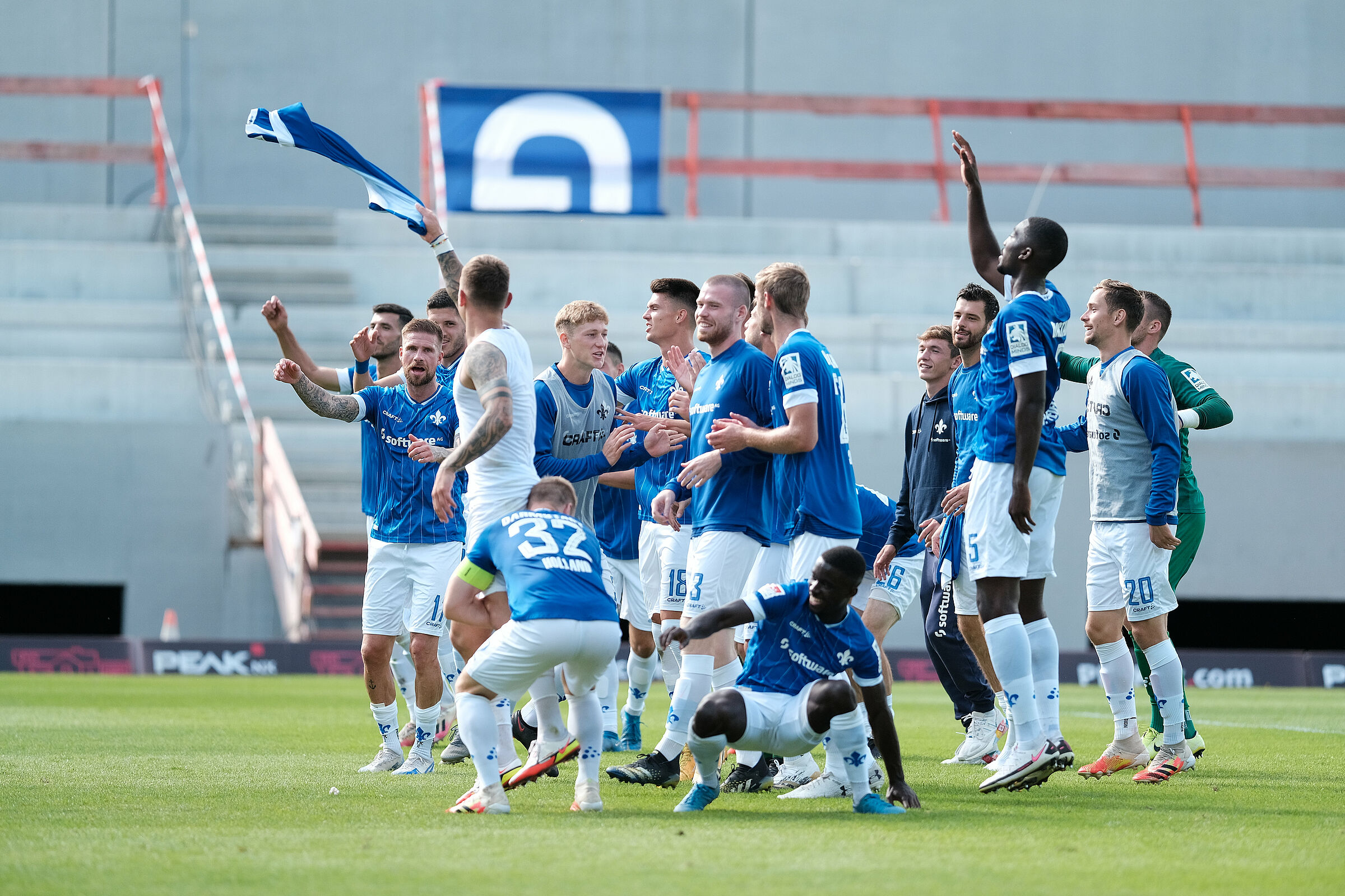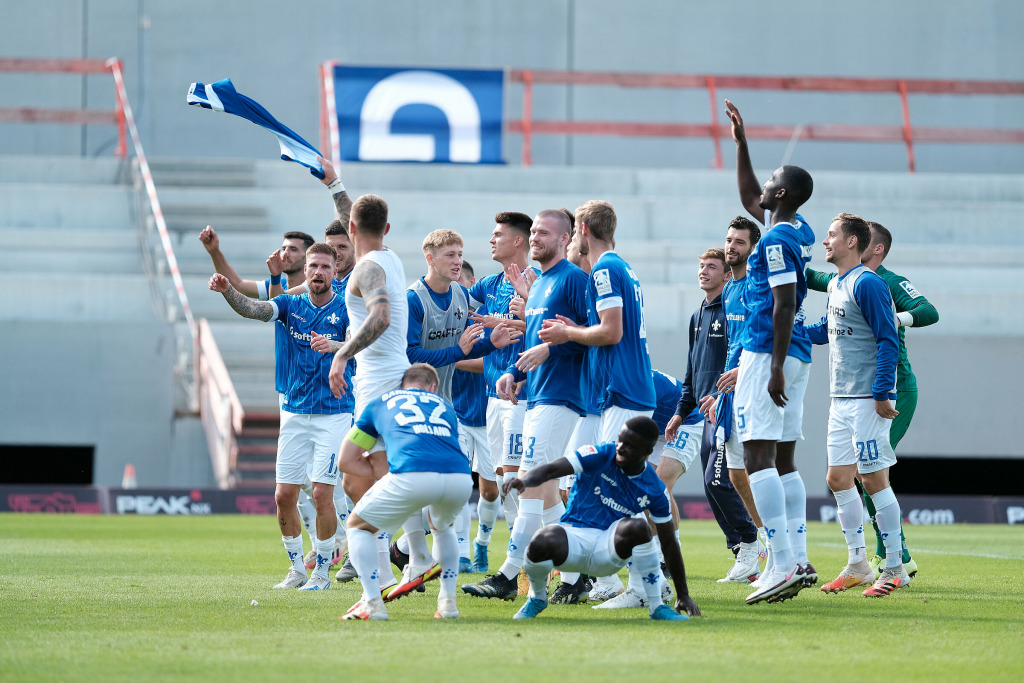 Aber rein ging er eben nicht, Schuhen hielt den Elfer. Und von den Lilien-Fans auf den Rängen beflügelt, schaufelten sich die Südhessen die nächsten drei Zähler aufs eigene Punktekonto. Pfeiffer: “Es war ein geiler Fußballtag, der großen Spaß gemacht hat.” Spaß machten dabei aber nicht nur die 90 Minuten, sondern auch die Szenen danach: Ein Team, das mit den Fans ausgiebig feierte. Erwachsene Männer, die sich wie kleine Jungs freuten und laut singend herumsprangen. Und ein Trainer, der diese Freude vorlebte. Zum Beispiel? Wenn sich die Mannschaft nach Abpfiff im Kreis zusammenfindet, verliert der Chefcoach meist ein paar Worte – zum Spiel, zur Leistung. Doch nicht an diesem Samstagnachmittag am Böllenfalltor. Lieberknecht stand mitten im Kreis, Spieler und Staff um ihn herum. Er riss die Arme hoch und animierte lautstark zum Mitsingen der Lilien-Hymne. Und alle taten es ihm nach. Lieberknecht sagte: “Ich leb’ das hier in Darmstadt mit Leib und Seele, mit Haut und Haare.” Man kauft es ihm ab. Ihm und dem gesamten Team.