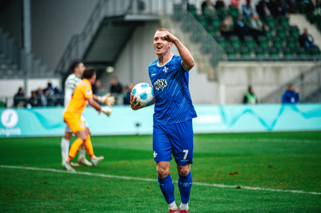 The goal to make it 2-0 by Fynn Lakenmacher. Of course, with a 5-1 win there are numerous scenes that deserve special recognition. But Lakenmacher’s debut goal, which was worth seeing, finally put the Lilies on the road to victory in Fürth. Since Florian Kohfeldt took office, SV 98 had taken a 1-0 lead in games against Braunschweig, Magdeburg, Köln, Ulm and Dresden. The South Hesse team conceded a 1-1 draw in all games, even though they were still able to win the matches with Köln and Dresden. „We had talked about exploiting opportunities beforehand and also the minutes after our own goal, in which we often quickly conceded another goal. Today we were highly concentrated and went after it,“ Kai Klefisch summed up after the game, naming one important key to a clear away win. Isac Lidberg played the ball into the penalty area, Lakenmacher first shielded the ball with his massive body and then, with a turning movement, placed it in the far corner. Worth seeing and at the same time immensely important. This goal dealt a visibly unsettled Fürth team another blow in the neck; in retrospect, for SV 98 it was probably the decisive moment for the goal festival that followed. In addition, the goal by the attacker, who was substituted after just under half an hour, also underlined the statements of head coach Kohfeldt, who had already increasingly praised and emphasised the “breadth” of the squad. „All the players are in rhythm. Many players are in good shape. That’s giving the coach a positive headache.“