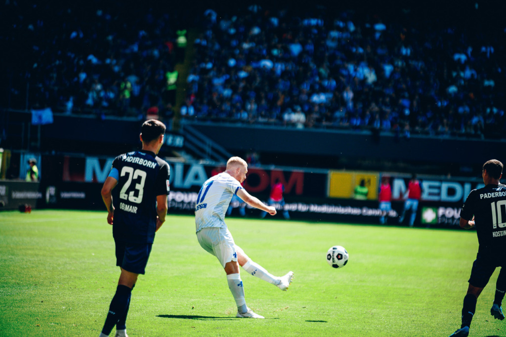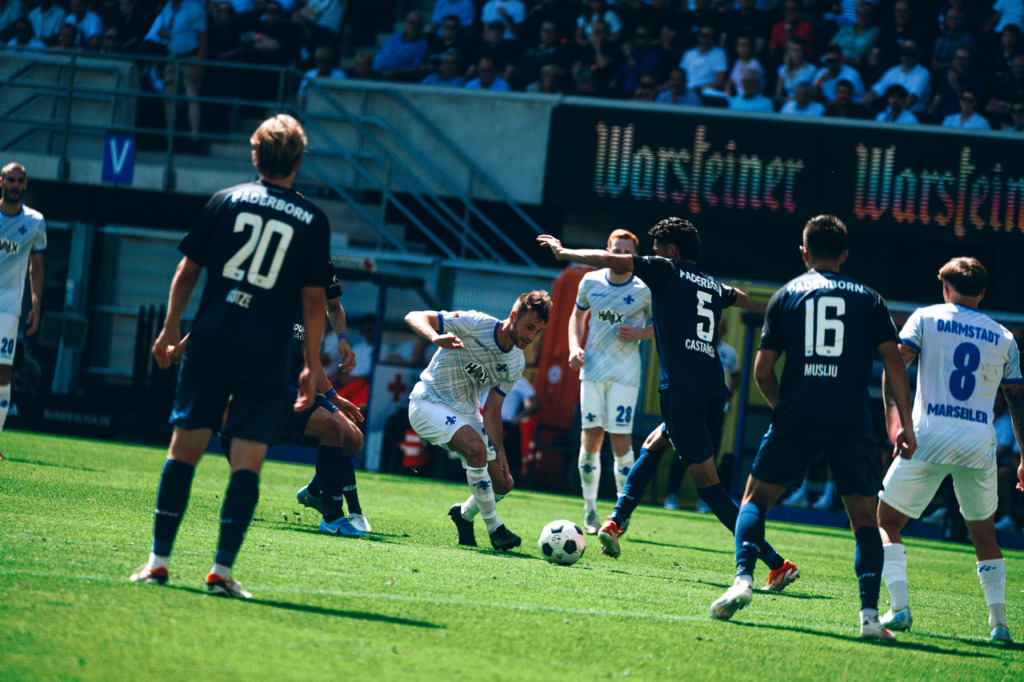 In the first away game, Darmstadt got off to a dream start in Paderborn. Although the hosts had the first chance through Kostons who passed it wide on 4 minutes, the South Hesse team took the lead three minutes later: Kai Klefisch played perfectly into the path of Oscar Vilhelmsson, the Swede remained ice-cold and flashed it into the bottom corner in the 7th minute.