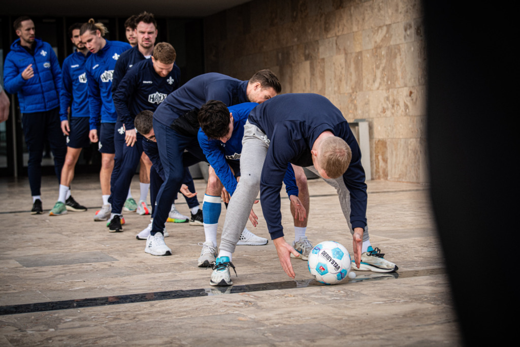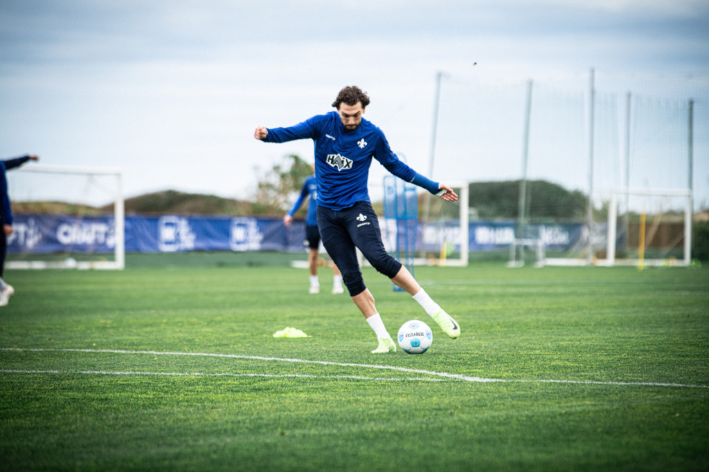 The training started at 10:30 a.m. with a detailed activation, and the session on the grass ended more than two hours later. „The session was long, but at the same time tough. After a long warm-up, we went into the playful and tactical things and worked on details. At the end there was a final game,“ said Kai Klefisch, summarising what happened on the field beforehand was. Just detailed work. At 11 against 0, the Lilies kept going through their routines, carefully coached by Kohfeldt, whose voice always found its way through the gusts of wind blowing in from the beach. In the following 8 against 8 game, many of the previously rehearsed processes were recognisable; the players were always looking for determined offensive solutions. “It can continue like this,” explained Klefisch with a smile, the progress of the pleasant weeks is visible and at the same time ensures that the Lilies remain willing to learn and inquisitive and also complete one or two mammoth units with a lot of enthusiasm.