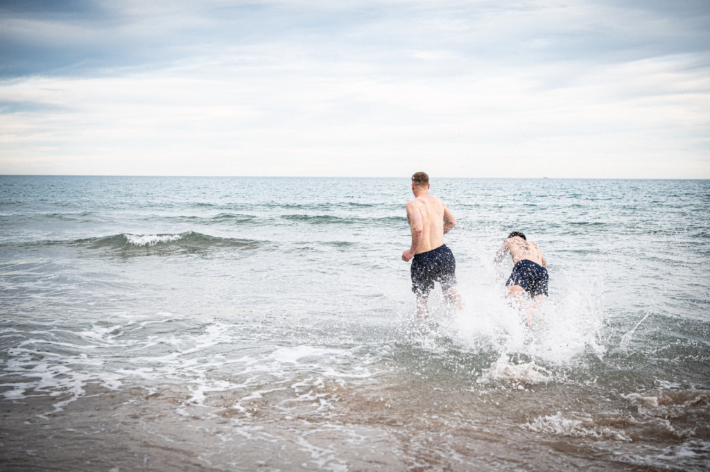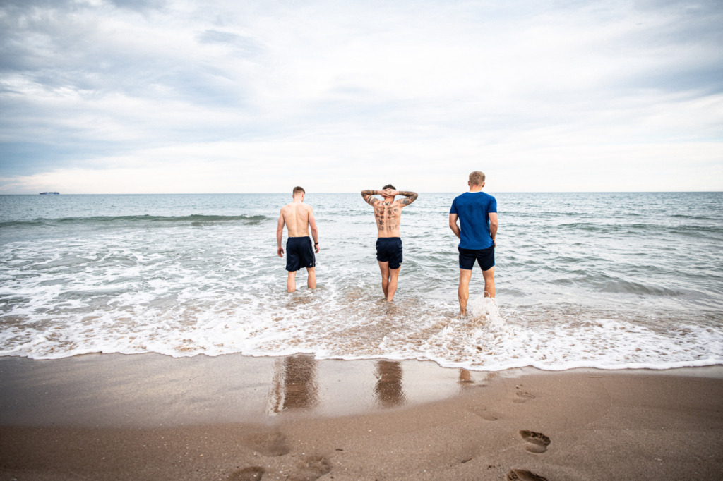 3) Headfirst into the Mediterranean? I’ll actually be there straight away. But not in January. I think Andi Müller was thinking something similar when he looked at me with a look that roughly said: „Are they crazy!?“ Together with Clemens Riedel and Luca Marseiler we went down to the beach in El after the afternoon session Saler. While Andi cooled down his feet and calves, I decided to take photos of Clemens and Luca from a safe distance as they went headfirst into the water, the water temperature here near Valencia is supposed to be just around 15 degrees Celsius – if that… But what looked like fun for the boys (and certainly was) also had a serious background: after a strenuous session, you need to regenerate your body in the slightly oversized ice bath. The Mediterranean is not just for vacation, but also for regeneration in January.