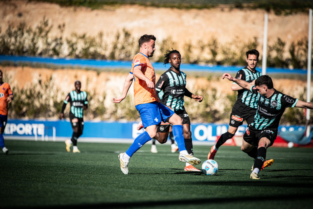 The Lilies say goodbye to the training camp with at least a little sporty Olé! In La Nucia, SV 98 won 1-0 against Conference League participants FC St. Gallen. The test against the Swiss lasted a total of 120 minutes, in which Fraser Hornby demonstrated his accuracy. The striker scored three times, but each time the goal was whistled back. Hornby & Co. showed their enthusiasm in the encounter and set the tone for most of the game. Afterwards, our head coach was also satisfied with what he had seen. Florian Kohfeldt: „I’m happy because we were able to play every game and didn’t have any injuries.“ We saw a lot of how we wanted to play football. We were against a Conference League participant, the dominant team with significantly more scoring chances and kept a clean sheet. This meant we were able to finish the training camp well and are already looking forward to the training week to prepare well for Düsseldorf.”