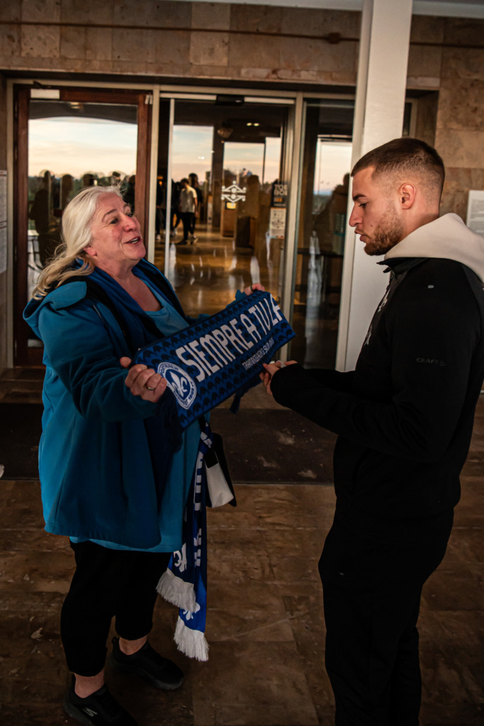 But he wasn’t the only one who shared this opinion. „I find it fascinating. You can have a normal conversation with the players; they’re really approachable and very down-to-earth,“ said Susi Hofmann, a long-time Darmstadt supporter. She wore a blue scarf with the white inscription „Siempre a tu lado“ around her neck – which translates to „Always by your side.“ It was an exclusive fan scarf for all participants of the fan trip. She also brought her white Darmstadt 98 T-shirt to take advantage of the special opportunity and collect as many autographs as possible. „I grew up with Darmstadt. I’m a regular at the stadium, and being here now and meeting everyone is simply fantastic,“ Susi continued.