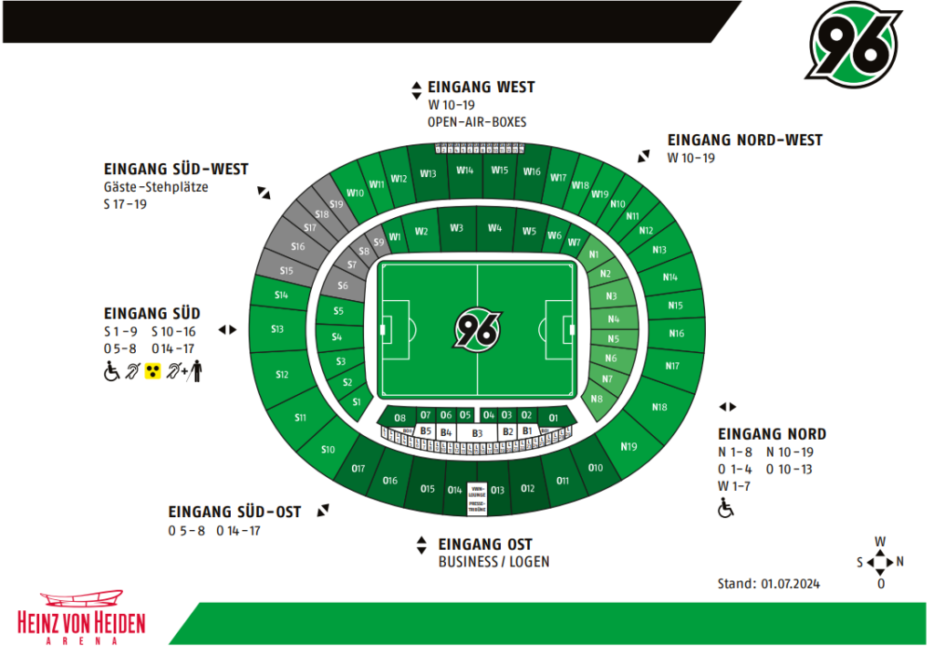 As before, people with the “Special Parking Permit for Severely Disabled People with Exceptional Walking Disabilities” will be allowed through by the police and security services to the parking lot (P4) of the State Sports Association (LSB) on Ferdinand-Wilhelm-Fricke-Weg. From there, disabled access is easy to reach at the south entrance (entrance tickets for blocks S1-9, S10-16, O5-8 and O14-17).