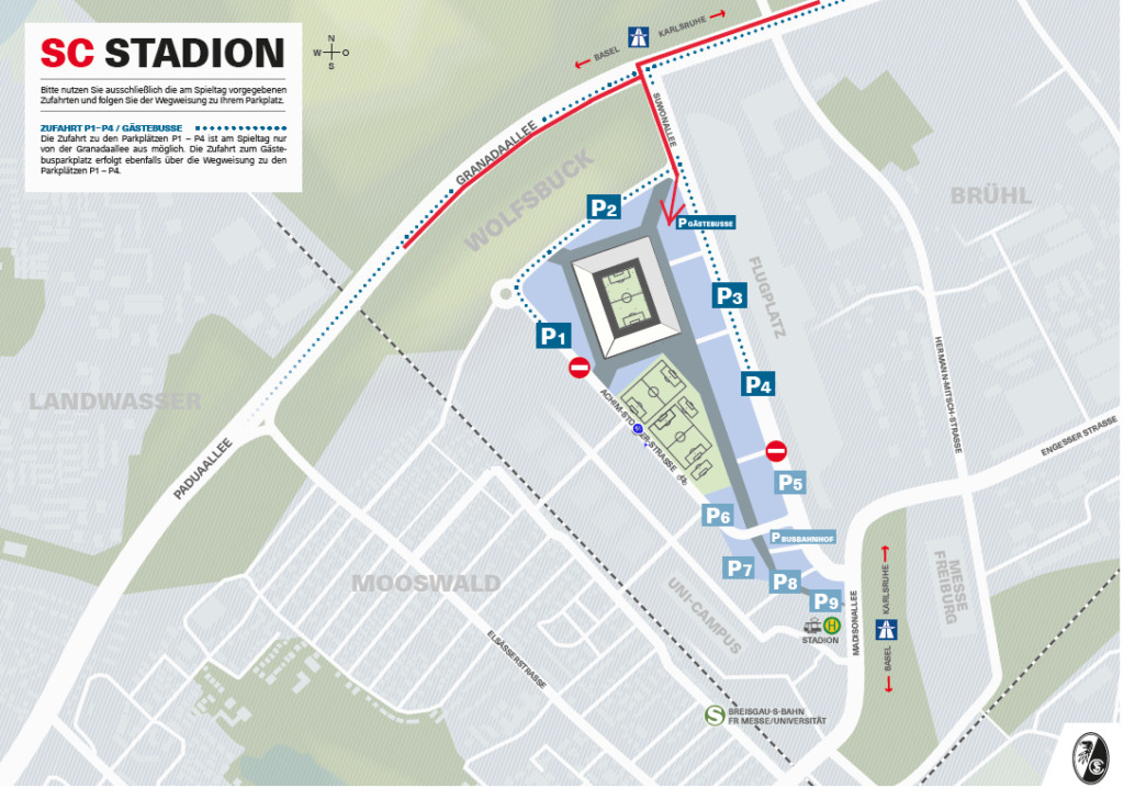 Spectators arriving by car without a parking ticket can park in the nearby Freiburg Trade Fair parking lot. Parking there costs ten euros starting two hours before kickoff. Fans parking earlier pay only four euros.