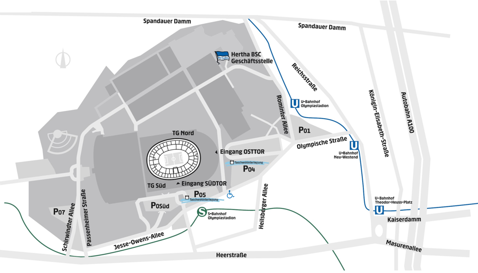 There are various parking spaces available around the Olympic Stadium. The official guest parking lot is PO7. The parking fee is €10. Disabled parking spaces are located in PO5. Use is free with a blue or orange parking permit. Otherwise, parking is free along Heerstrasse.