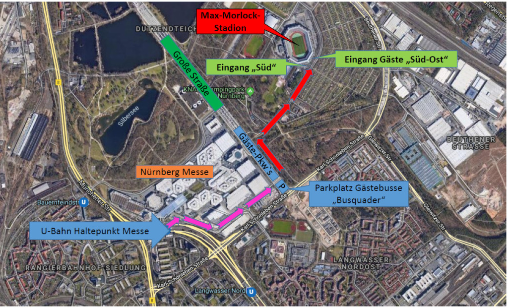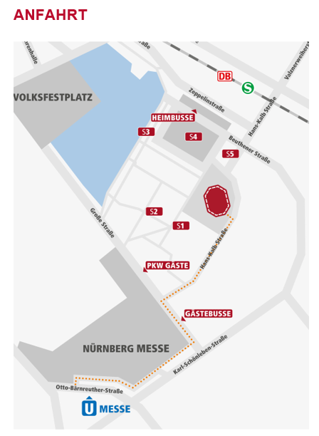For all fan buses (€15) and car drivers (€5), we recommend the „Große Straße“ parking lot. The parking lot is signposted from the motorway (Nürnberg junction or motorway exit N-Fischbach) via the traffic guidance system. Simply follow the „Guests“ signs. The walk to the guest entrance is approximately 10-15 minutes. An environmental sticker is not required.