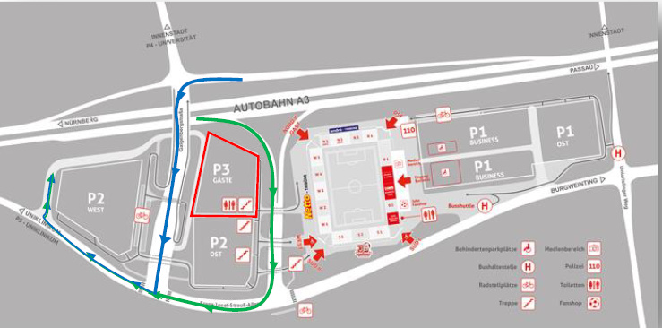 Enter into Googlemaps: Jahnstadion Regensburg parking lot P3. This opens 2.5 hours before the game starts, also at 11am on Sundays. The stadium is located directly on the A3 motorway (exit 100a Regensburg-Universität).