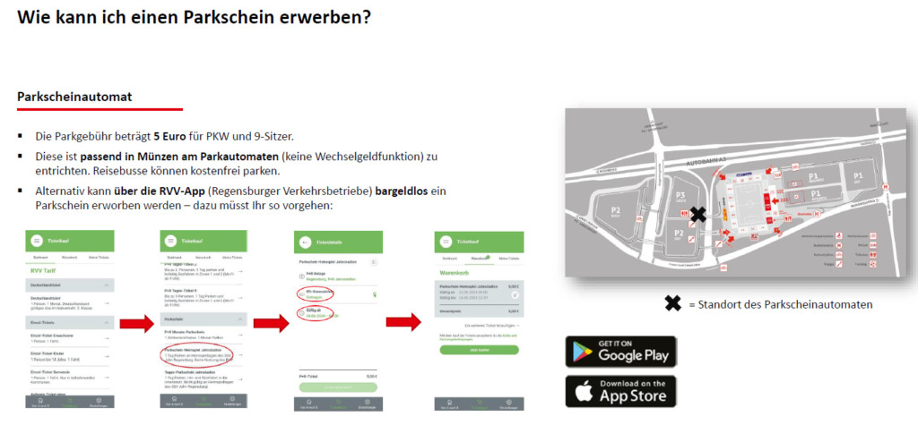 Parking is free for buses in the guest area. The city of Regensburg charges a parking fee of 5 euros for cars, which can be paid in coins at the corresponding machine on P3 or via the RVV app. Please note: The parking fee must be paid immediately after parking the vehicle. Please also remember that you must move immediately after entering the guest parking lot P3. Otherwise you risk getting fines.