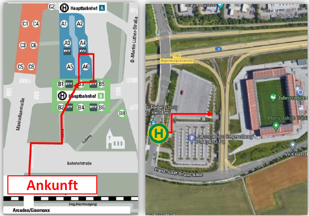 Lockers for locking personal items and toilet facilities are located on platform 1. The regular shuttle service on line F is located at bus platform A6. Guest fans using this line should make themselves known to the bus driver. Line F runs regularly and without stops to the Jahnstadion Regensburg. Guest fans can, after consultation with the bus driver, get off at the makeshift stop “Galgenbergstrasse” after the stop for home fans and from there get to the guest entrance. Access to the guest area is only possible via the guest car park P3.