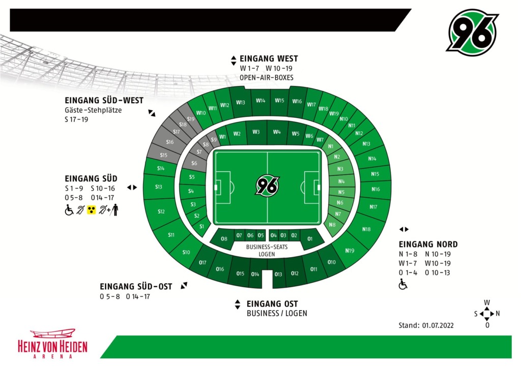Menschen mit Sehbehinderung: Neben den Plätzen für Rollstuhlfahrer*innen gibt es in der Heinz von Heiden Arena Blindensitzplätze im Block O8 mit Live-Spielkommentar (Eintrittspreis: 10 Euro). Die Live-Reporter sitzen inmitten der Sehbehinderten und bieten diesen 90 Minuten lang detaillierte Erklärungen zum Spielgeschehen. So können auch blinde Menschen das Spiel der Roten vor ihrem „geistigen Auge“ sehen und gleichzeitig die echte Live-Atmosphäre genießen. Hannover 96 stellt die technische Ausrüstung für diesen Service zur Verfügung.Für Menschen mit einer Sehbehinderung, die auf einen Rollstuhl angewiesen sind, haben wir im Block O8 Rollstuhlplätze (mit Live-Spielkommentar) vorgesehen. Die Begleitperson ist zur Betreuung des/der Behinderten mit im Stadion und hat freien Eintritt, der zur Verfügung gestellte Sitzplatz befindet sich in unmittelbarer Nähe zum/zur Sehbehinderten.