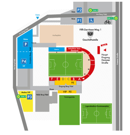 Alternativ ist die Anfahrt auch über die A1 bis Abfahrt Hiltrup möglich, dann durch Hiltrup durch Richtung Münster über die Hammer Straße. Anschließend der Hammer Straße bis zum Stadion folgen und hinter dem Stadion links in die Straße „Am Berg Fidel“ und der Beschilderung P4 folgen. Diese Strecke ist meist etwas weniger befahren, weil die Anreise nicht von der Innenstadt erfolgt.