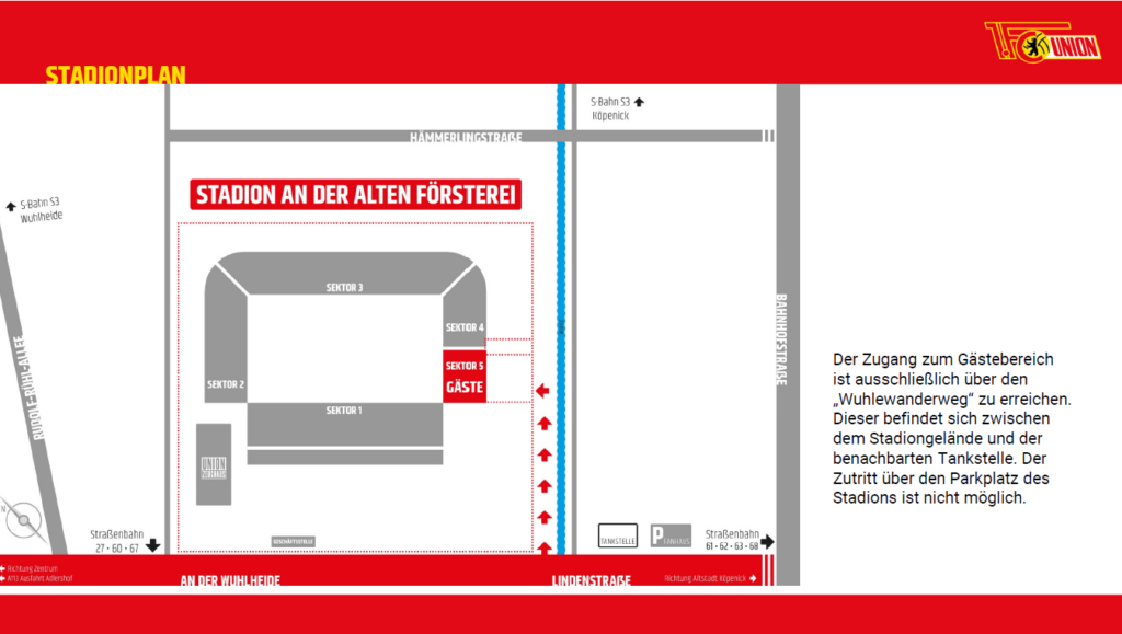 Der Zugang zum Gästebereich ist ausschließlich über den „Wuhlewanderweg“ zu erreichen. Dieser befindet sich zwischen dem Stadiongelände und der benachbarten Tankstelle. Der Zutritt über den Parkplatz des Stadions ist nicht möglich.
