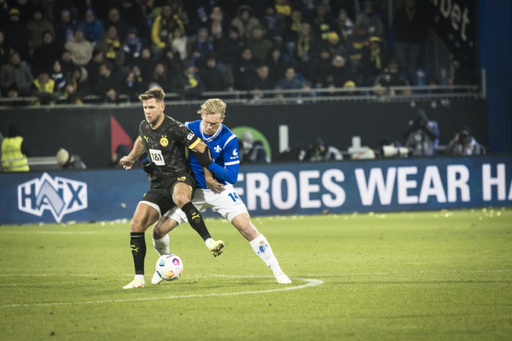 Nach einer Ecke verpassten die Lilien aus Ausgleich nur knapp: Fabian Holland brachte den Standard in die Mitte, Clemens Riedel verlängerte an den langen Pfosten und dort scheiterte Pfeiffer aus kurzer Distanz an Kobel im Dortmunder Tor (64.). Auf der Gegenseite lenkte Schuhen einen Versuch von Sabitzer um den Pfosten (68.).