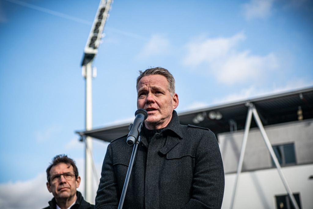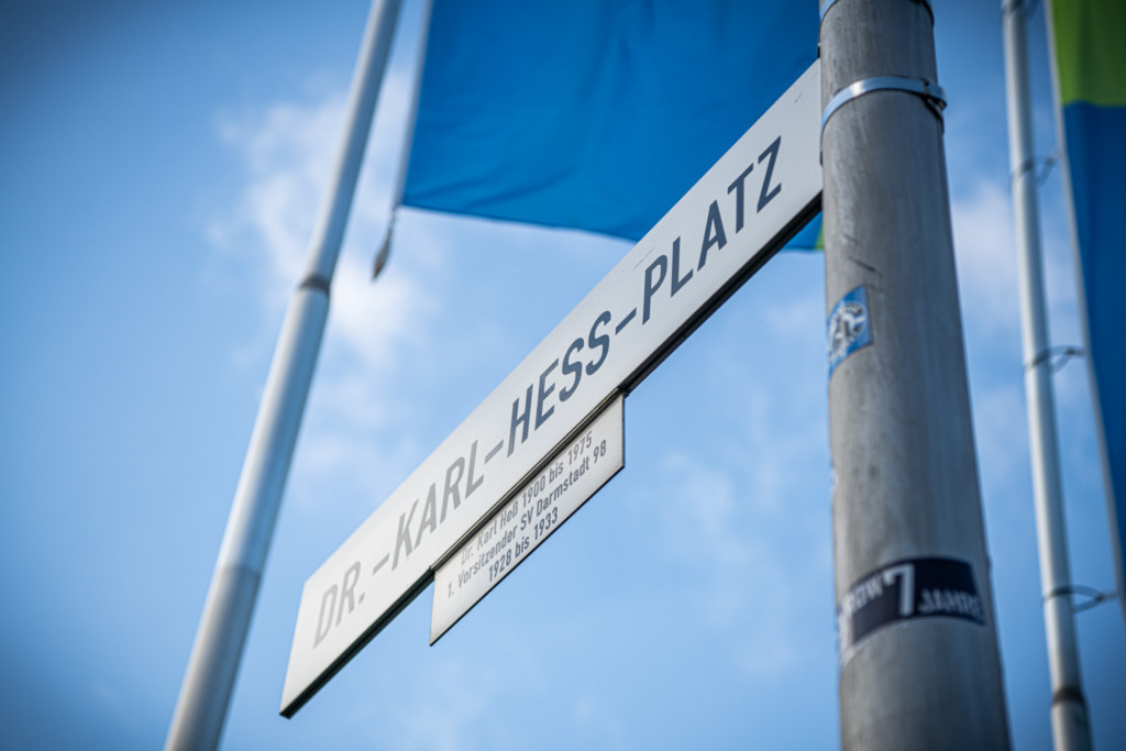 Die goldene Stolperschwelle auf dem Dr.-Karl-Heß-Platz soll den in der NS-Zeit zum Opfer gefallenen jüdischen Sportlerinnen und Sportlern gedenken. „An Spieltagen werden tausende Menschen über die Schwelle laufen. Sie soll einen Moment des Innehaltens und des Erinnerns ermöglichen“, erklärte Markus Pfitzner in seiner Rede. „Wir als Darmstadt 98 sind ein Verein, der sich gegen Diskriminierung und Ausgrenzung stark macht. Seit vielen Jahren sind wir erinnerungskulturell stark engagiert. Und wir sind stolz darauf, dass wir Themen wie diese aktiv angehen und uns nicht wegducken“, fuhr der Vizepräsident des SV Darmstadt 98 fort.