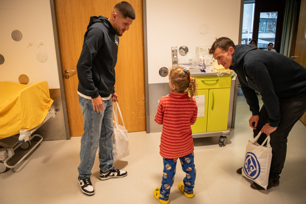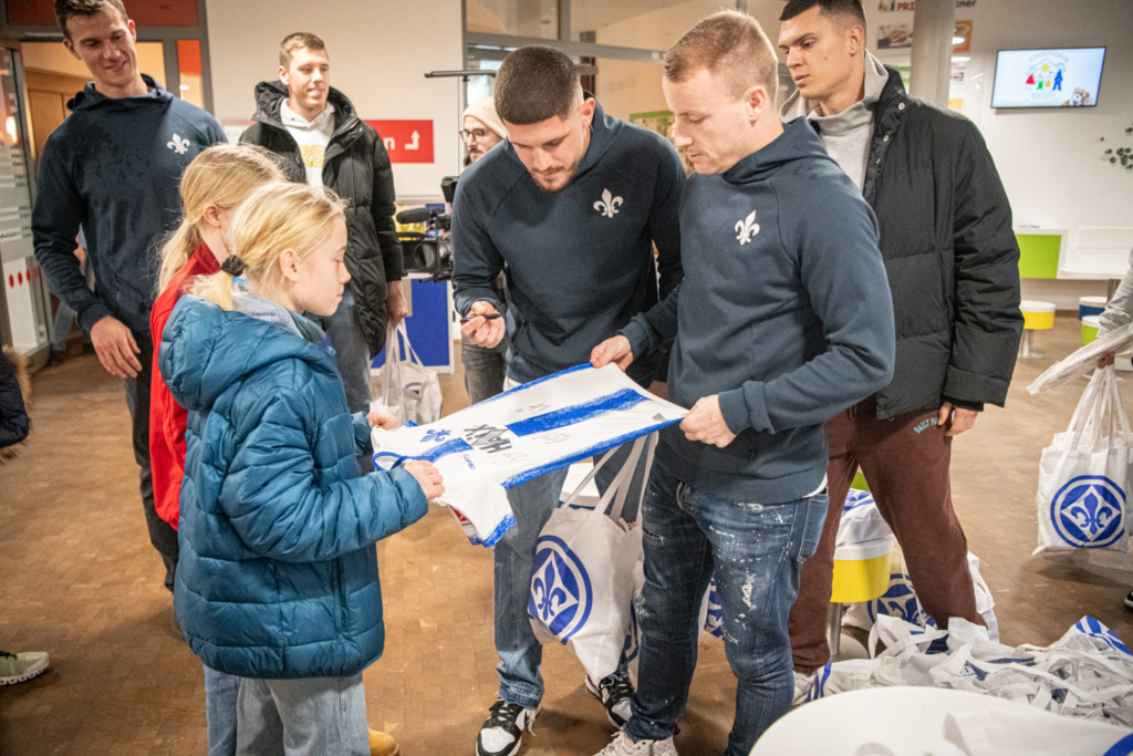 Rote Locken, ein Lilien-Schal um den Hals und ein breites Lächeln im Gesicht. Stolz präsentierte ein kleines Mädchen den Profis des SV 98 ein selbst gemaltes Darmstadt-Logo. Für den Besuch der Spieler hatte sie sich mit dem kleinen Präsent vorbereitet, welches sie Emir Karic übereichte. Am Freitagnachmittag (26.1.) besuchte die Mannschaft des SVD die Kinder im Klinikum Darmstadt sowie den Darmstädter Kinderkliniken Prinzessin Margaret. Neben der Übergabe der mit Lilien-Fanartikeln prall gefüllten Geschenkbeutel schrieben die Spieler auch Autogramme und erfüllten jeden Fotowunsch.