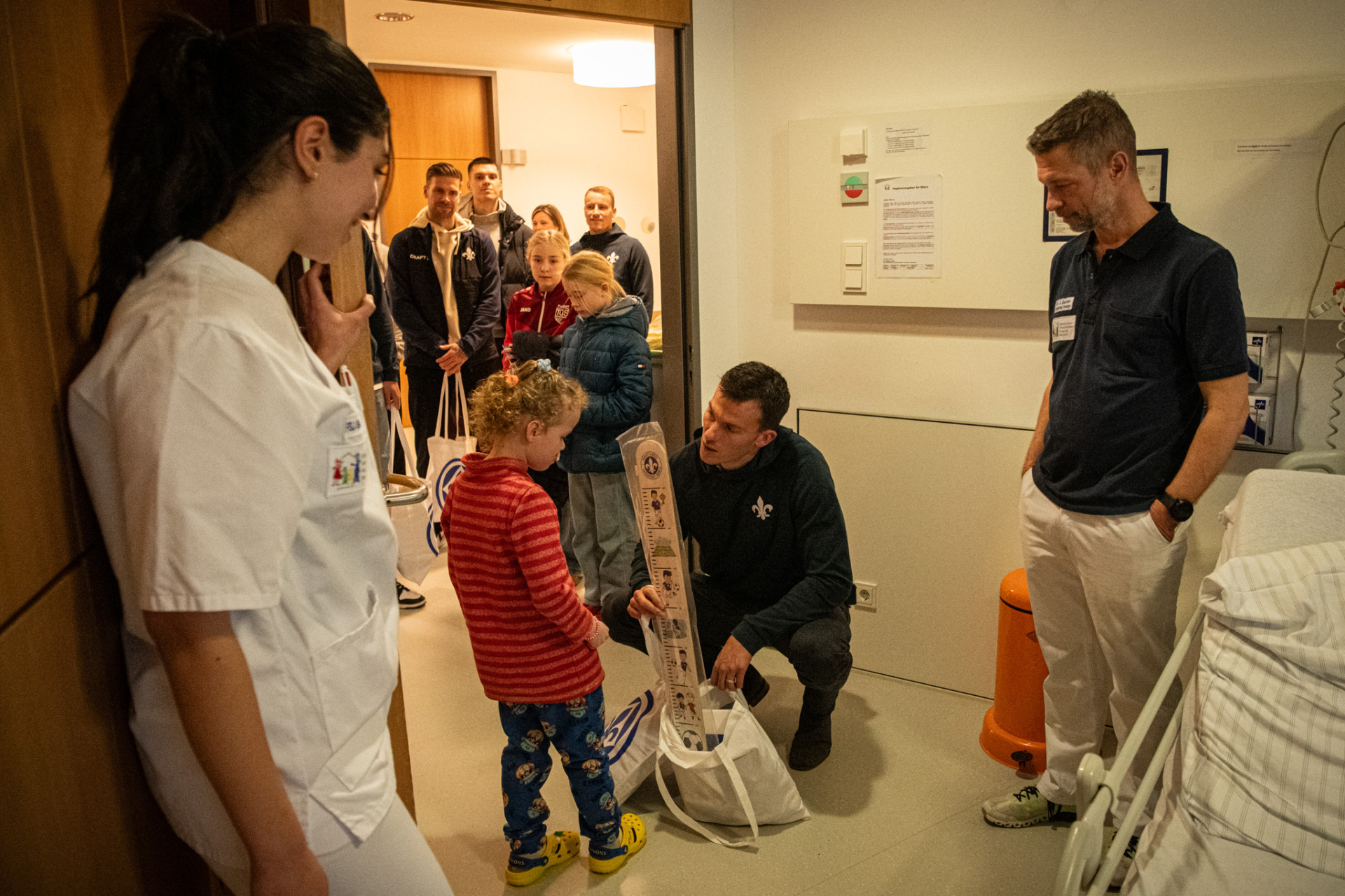Dr. Med. Georg Frey von der Kinder-Intensivstation des Klinikums Darmstadt sprach von einem „besonderen Tag“ und fügte hinsichtlich seiner sehr jungen Patienten an: „Die Spieler waren beeindruckt und still.“ Klaus Gjasula bestätigte dies: „Der Besuch geht nicht spurlos an einem vorbei.“ Doch die ernsten und teils dramatischen Geschichten der Kinder traten für diesen Nachmittag ein wenig in den Hintergrund. Begeistert ließen sie sich T-Shirts und Autogrammkarten unterschreiben, posierten für Fotos und packten Brotdosen, Messlatten und Spiele im SVD-Design und verschiedene weitere Fanartikel aus ihren Geschenkbeuteln aus.