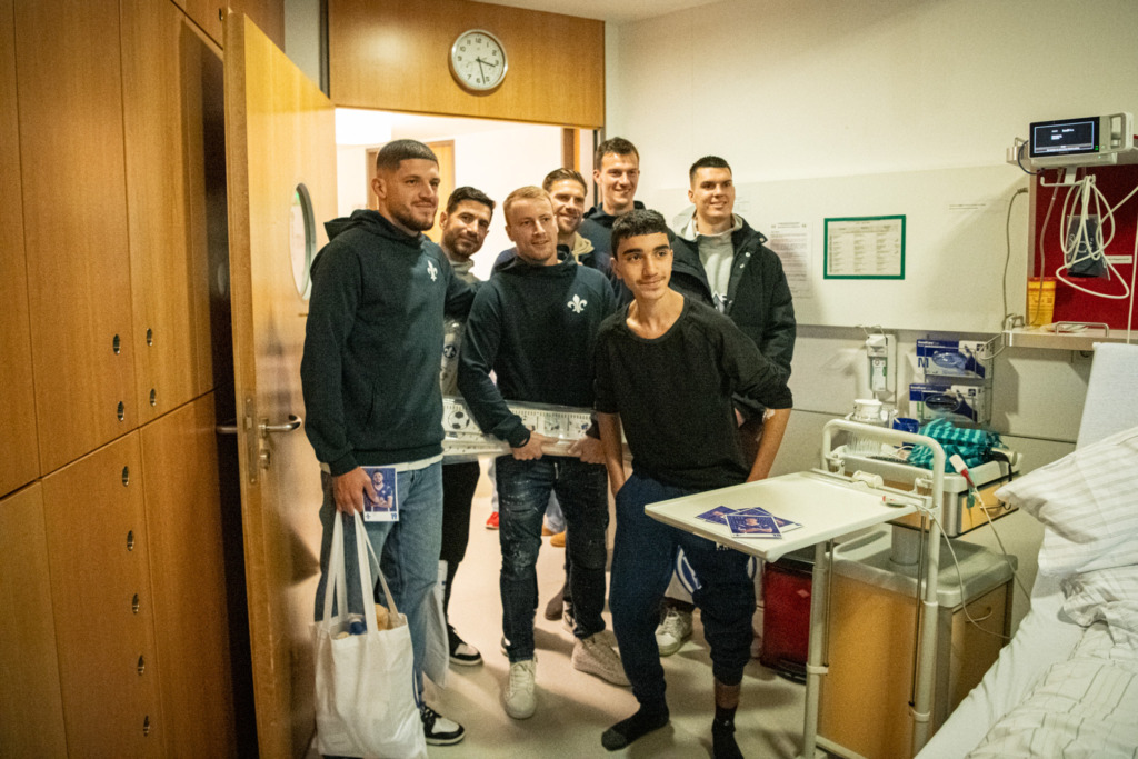 Kranken Kindern ein Lächeln ins Gesicht zaubern: Das war der Wunsch der Mannschaft des SV Darmstadt 98, als sie bepackt mit verschiedenen, blau-weißen Geschenken in der vergangenen Woche zwei Darmstädter Krankenhäuser besuchte. Doch beschenkt wurden an diesem Nachmittag nicht nur die Kinder, sondern auch die Spieler.