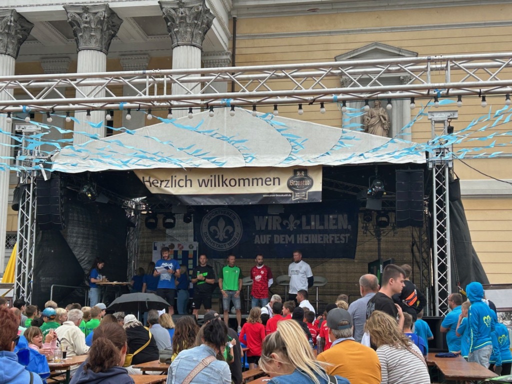 A former Lilies player will compete in various matches on behalf of your team and collect points. First and second place finishers will win tickets to a home game. To support your player, please provide them with a jersey from your club to wear during the games—and, of course, cheer them on loudly. Together, we want to create a unique Heinerfest atmosphere on Karolinenplatz in Darmstadt.