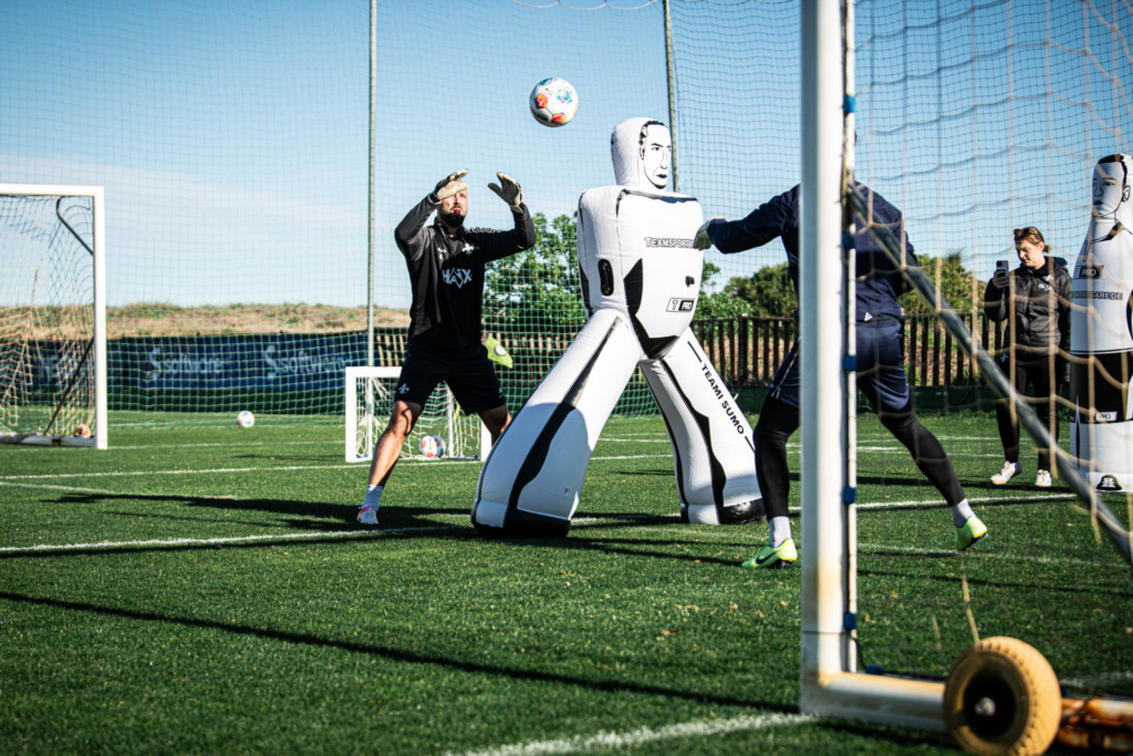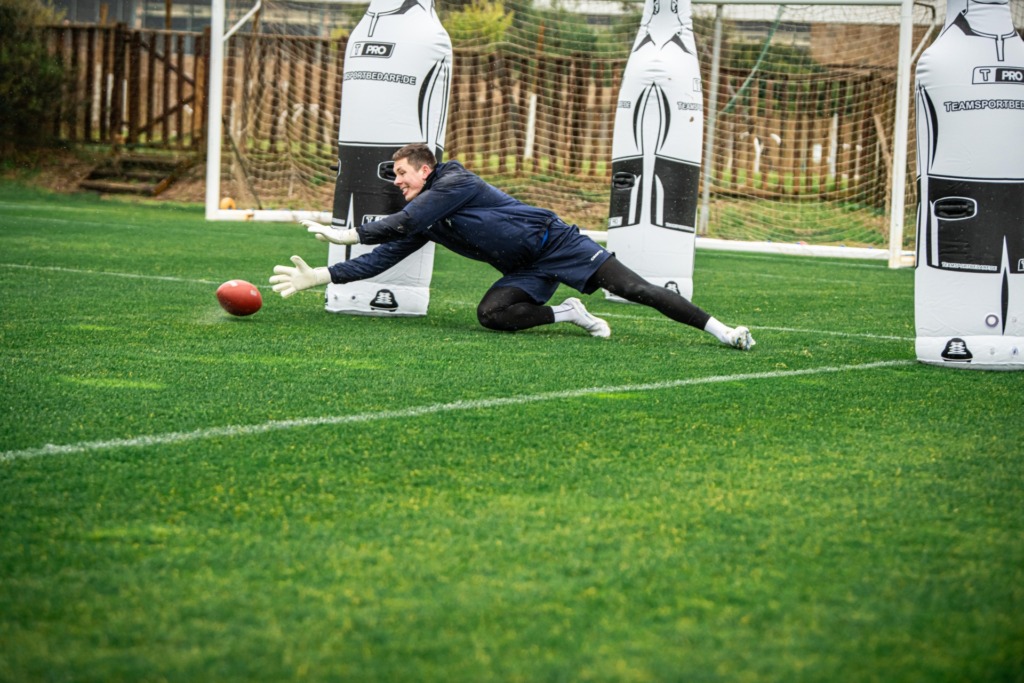 „Flo sometimes calls me a bit of a goofball. (laughs) But it’s fun because variety is important for the guys, and all these things serve a purpose. People learn best when they’re having fun, so I like creating these kinds of scenarios. But it has to make sense. Especially on social media, you constantly see influencer goalkeepers doing things that look good in the video but aren’t effective. We certainly don’t do that. For example, if I use a football, it’s about the players watching the ball and its trajectory very closely and reacting lightning-fast if the football changes direction again.“