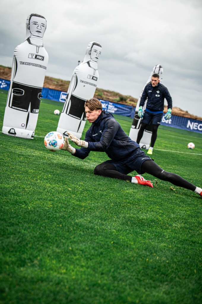 „These days, it’s often mentioned in the courses and conferences for the goalkeeping coach license that the role of the goalkeeping coach is shifting somewhat towards that of an assistant coach. From my perspective, it makes a lot of sense to involve the strikers in training and essentially turn it into striker training. Every goalkeeper has certain patterns. I try to identify these and then pass them on to our strikers before each match. Even so, it sometimes feels wrong to praise the strikers for a good shot against ‚my‘ goalkeepers. (laughs) Set pieces are primarily Scholty’s responsibility, of course, but sometimes he asks me for advice or about something unusual about the opposing goalkeeper, and I try to help with that.“