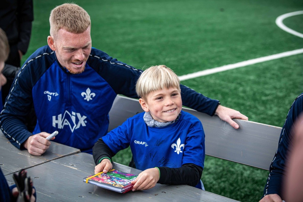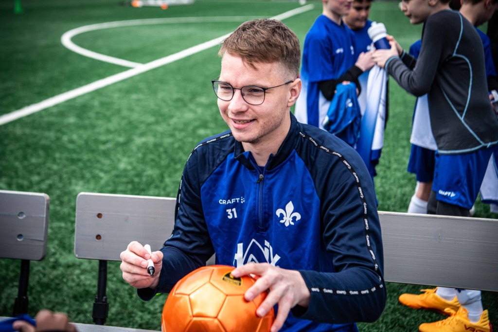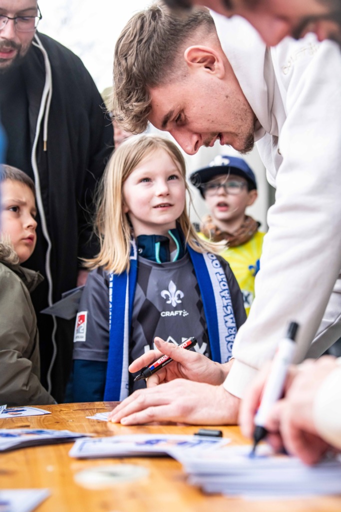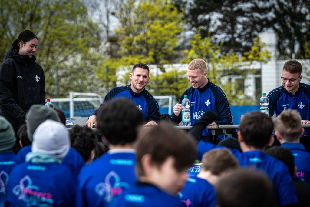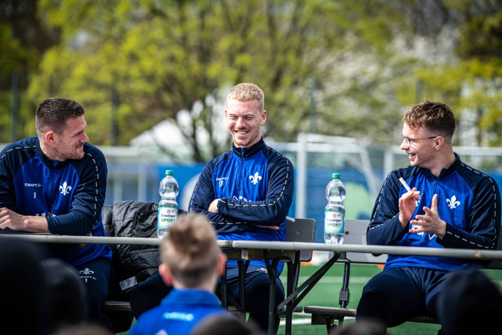 Ganz große Kinderaugen gab es am gestrigen Dienstag (31.3.), als sich die Lilien-Profis in Person von Marcel Schuhen, Kai Klefisch und Niklas Schmidt am Nachwuchsleistungszentrum beim Merck-Lilien-Fußballcamp 2026 zeigten. Die drei Profis stellten sich einer munteren Fragerunde, bei der Themen wie das Lieblingsessen der Jungs, Rote Karten und die Frage aller Fragen nach „Messi oder Ronaldo“ abgeklappert wurden. Im Anschluss hatte jedes der über einhundert teilnehmenden Kinder die Chance, sich Autogramme und Fotos der Spieler zu sichern, die währenddessen gut gelaunt mit den Kindern scherzten. Eine rundum gelungene Mittagspause im NLZ!
