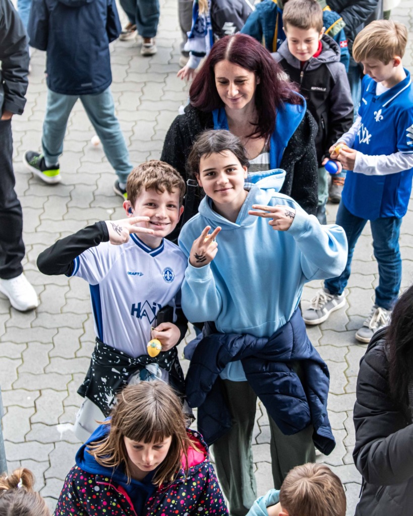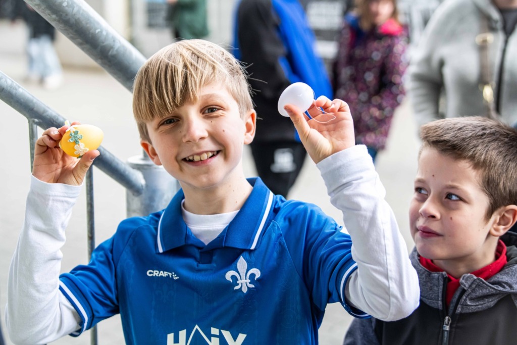 Das Funkeln in den Kinderaugen war auch am heutigen Mittwoch (1.4.) wieder zu sehen – und zwar bei der Ostereier-Suchaktion der Bölle Bande. Auf der Gegengerade im Merck-Stadion am Böllenfalltor beteiligten sich 150 Kinder samt Eltern an der Suche. Geflutet von suchenden und findenden Kindern war Stimmung auf der Gegengerade prächtig. Zwei gefundene Ostereier bedeuteten eine kleine Überraschung aus Schokolade. Matej Maglica und Marco Richter waren ebenso dabei und versorgten die Kinder neben Schokolade auch mit Autogrammen und erfüllten die Fotowünsche der Bölle Bande. Mit Selfies, Autogrammen und Schoko-Osterhasen ging es für die Kids dann glücklich zurück nach Hause.