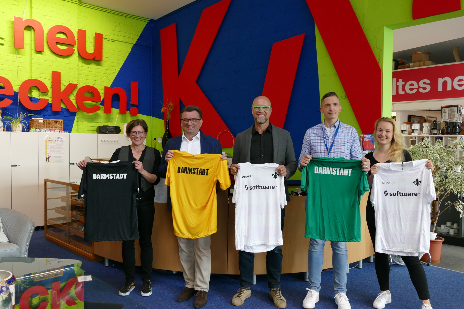 Seit Samstag, 15. Juni, können Fußballfans Aufwärmshirts der Lilien aus der Saison 2022/23 in Darmstadts Gebrauchtwarenkaufhaus KAGEL erwerben. Die ungetragenen Shirts wurden vom Geschäftsführer Marketing & Vertrieb des SV Darmstadt 98, Martin Kowalewski und dem stellvertretenden Betriebsleiter des EAD, Frank Siemund, übergeben.