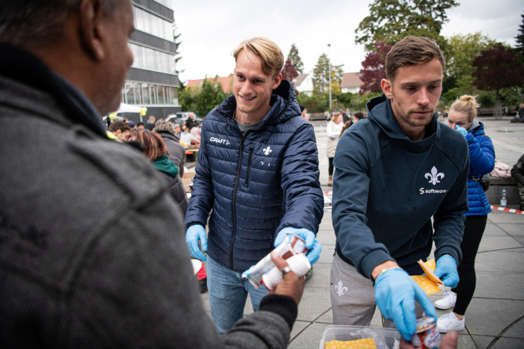 Jeden Sonntag verteilt die private Initiative „Obdachlosen helfen Darmstadt“ auf dem Europaplatz am Westausgang des Hauptbahnhofs warme Mahlzeiten und vieles mehr an Obdachlose und Bedürftige – und das schon seit zehn Jahren. Zum Jubiläum am 22. Oktober bekamen die ehrenamtlichen Helfer*innen tatkräftige Unterstützung des SV Darmstadt 98. So packten die Lilien-Profis Jannik Müller, Oscar Vilhelmsson und Filip Stojilkovic fleißig mit an und halfen dabei mit, das Essen an die Bedürftigen auszugeben. „Wir haben sehr gerne geholfen“, sagte Jannik Müller stellvertretend und hob hervor: „Unser riesiger Respekt und danke an alle Helfer, die das hier jeden Sonntag organisieren und sich darum kümmern, dass die Menschen etwas Warmes zu essen bekommen.“ Neben der tatkräftigen Unterstützung bei der Essensausgabe konnte der SV 98 an diesem Tag auch die Geld- und Sachspenden überreichen, die bei der Übernachtungsaktion Anfang Oktober im Merck-Stadion am Böllenfalltor gesammelt wurden.