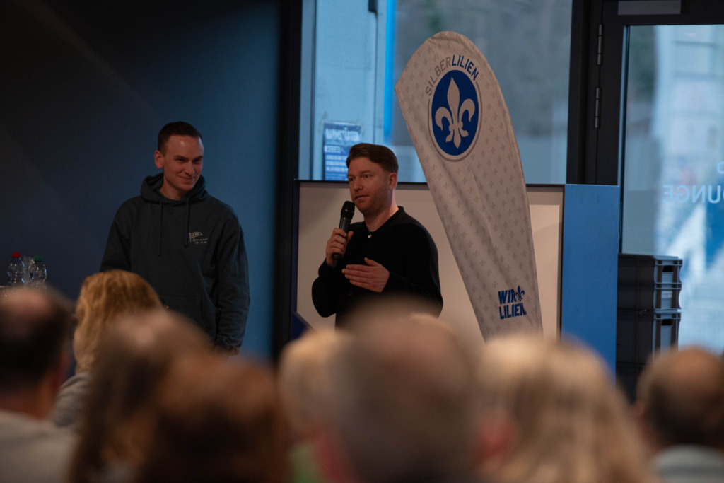 A highlight was the interview between Alex Lehne, the SV 98 fan liaison, and Paul Fernie, the SV Darmstadt 98 sporting director. Christmas stories and poems were also recited, creating a festive mood. Furthermore, during the event, wool clothing for the homeless was presented to Petra Bier of „Aus der Not Darmstadt e.V.“