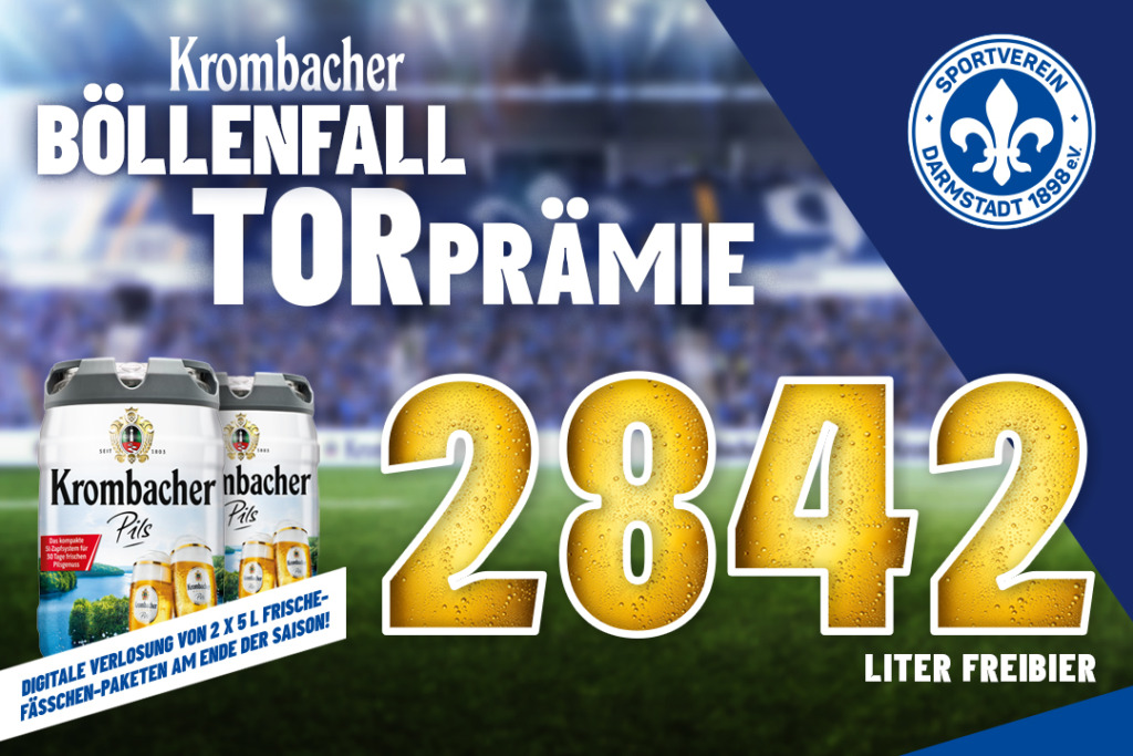 For every home goal scored by the Lilies, fans of SV Darmstadt 98 will be doubly rewarded in the 2024/25 season. In addition to the joy and excitement, the Lilies' supporters will also receive 98 litres of Krombacher Pils for each home goal scored by the Darmstadt team at the Merck Stadium at Böllenfalltor.