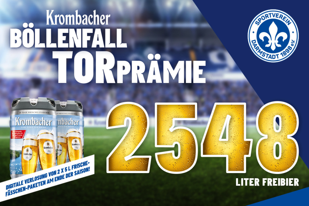 Für jedes geschossene Lilien-Heimtor werden die Fans des SV Darmstadt 98 auch in der Saison 2022/23 gleich doppelt belohnt. Denn neben der Freude und Begeisterung erhalten die Anhänger der Lilien auch noch 98 Liter Krombacher Pils pro Heimtreffer der Darmstädter im Merck-Stadion am Böllenfalltor.