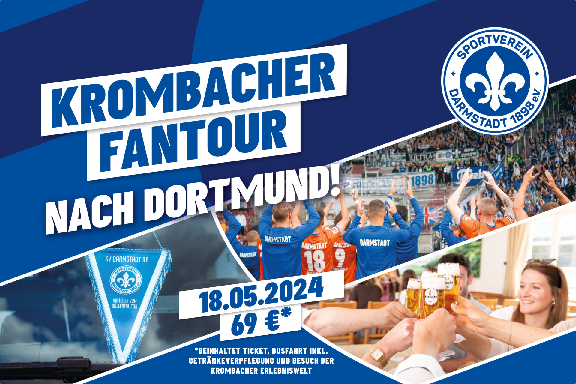 Our partner Krombacher is offering a special trip to the last away game. On the morning of May 18, 2024, the Krombacher Fan Tour will travel from Darmstadt to Krombach for a brewery tour including tasting and from there to the Signal Iduna Park, where SV Darmstadt 98 will be guests at Borussia Dortmund on matchday 34. You can find all information about the Krombacher Fan Tour in this message.