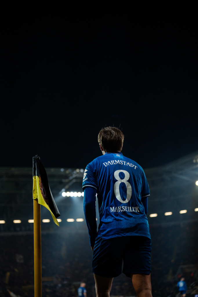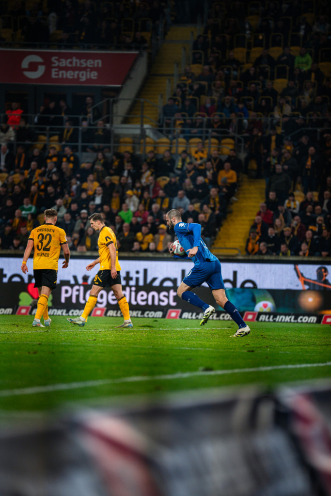 Creating opportunities from the 53rd minute onwards. After Jakob Lemmer’s red card in the 53rd minute, both teams battled it out again with equal numbers for around 40 minutes. Naturally, Dynamo Dresden adopted a different style of play during this phase than in the first 40 minutes of the match. With a 2-0 lead, they focused on stability and control, allowing Darmstadt more opportunities and repeatedly doubling up on Luca Marseiler in particular. This situation naturally made it difficult for Darmstadt to create many clear chances. Some inaccuracies, a lack of pace in their build-up play, or simply not optimal positioning in the penalty area all contributed to their struggles. Until the final stages (see „That went well“), Darmstadt only managed one truly good opportunity, when a deflected Marseiler cross in the 68th minute almost resulted in a goal. At this point, however, it is also appropriate to praise Dynamo Dresden, who handled their leadership maturely and did not really open the door for SV 98.
