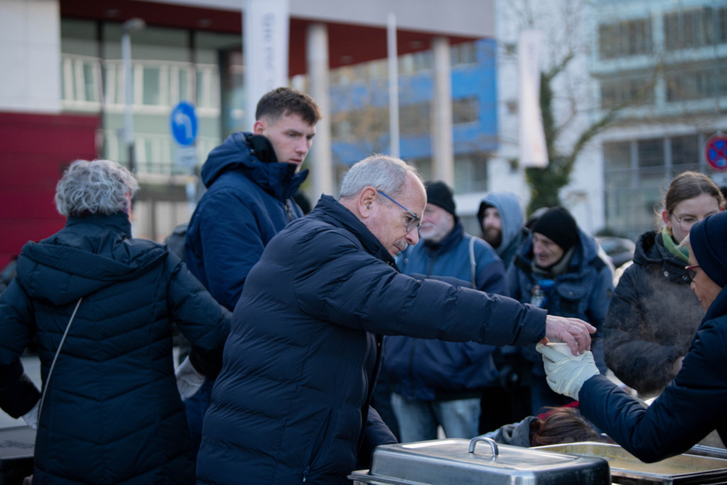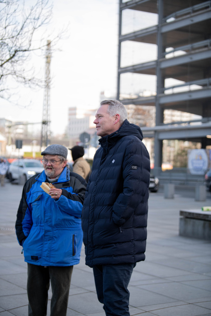 Am Sonntag wartete ein kleiner, aber ausgesprochen leckerer Speiseplan: Gulasch- und Kartoffelsuppe für obdachlose Menschen. Doch die Ausgabe verlief diesmal anders als gewohnt. Statt auf dem Trainingsplatz zu stehen, erschienen die Lilien-Profis Bialek, Papela, Furukawa und Klassen um 13 Uhr auf dem Europaplatz und gaben dort gemeinsam die warmen Mahlzeiten aus. Mit viel Zeit für persönliche Gespräche und einem offenen Ohr wollten die Spieler nicht nur helfen, sondern auch ein deutliches Zeichen setzen: Jeder Mensch verdient Wärme, Respekt und echte Aufmerksamkeit. Auch Vereinspräsident Markus Pfitzner ließ es sich nicht nehmen, vorbeizuschauen und die Aktion zu unterstützen. Zum Abschluss betonte er, wie wichtig dieses Thema für den SV Darmstadt 98 ist: „Wenn man sieht, wie viele Menschen hier auf der Straße stehen, wie sie frieren und Hunger haben, dann ist das die richtige Sache, wofür wir uns einsetzen. Deshalb setzen wir uns langfristig dafür ein, weil es mehr Armut in unserer Stadt gibt, als man sich eingestehen mag!“