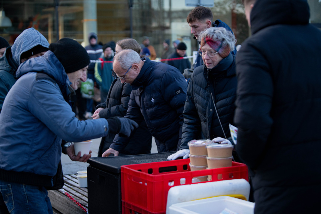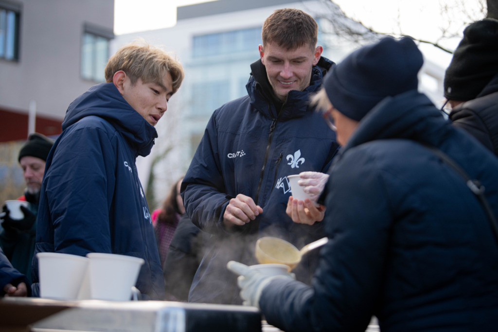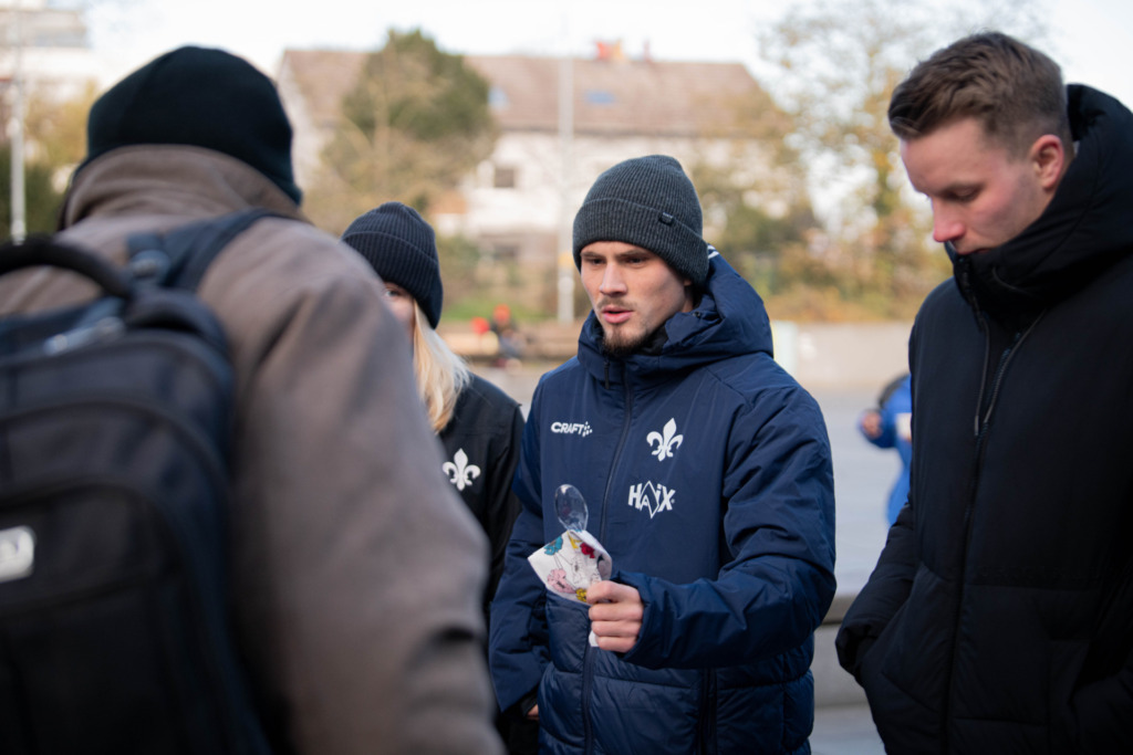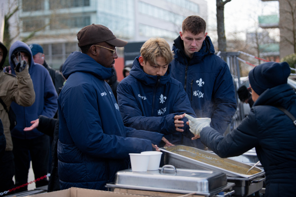 Um 13 Uhr am Sonntag (23.11.) begann auf dem Europaplatz in Darmstadt die Essensausgabe: Yōsuke Furukawa, Leon Klassen, Bartosz Bialek und Merveille Papela reichten mit einem Lächeln warme Mahlzeiten an Obdachlose und Bedürftige aus. Die Spieler der Lilien packten tatkräftig mit an und sorgten dafür, dass niemand hungrig blieb. Damit unterstützten sie die Initiative „Obdachlosen helfen Darmstadt“, die seit über zehn Jahren jeden Sonntag am Westausgang des Hauptbahnhofs ehrenamtlich Essen und weitere Hilfen für Menschen in Not bereitstellt.