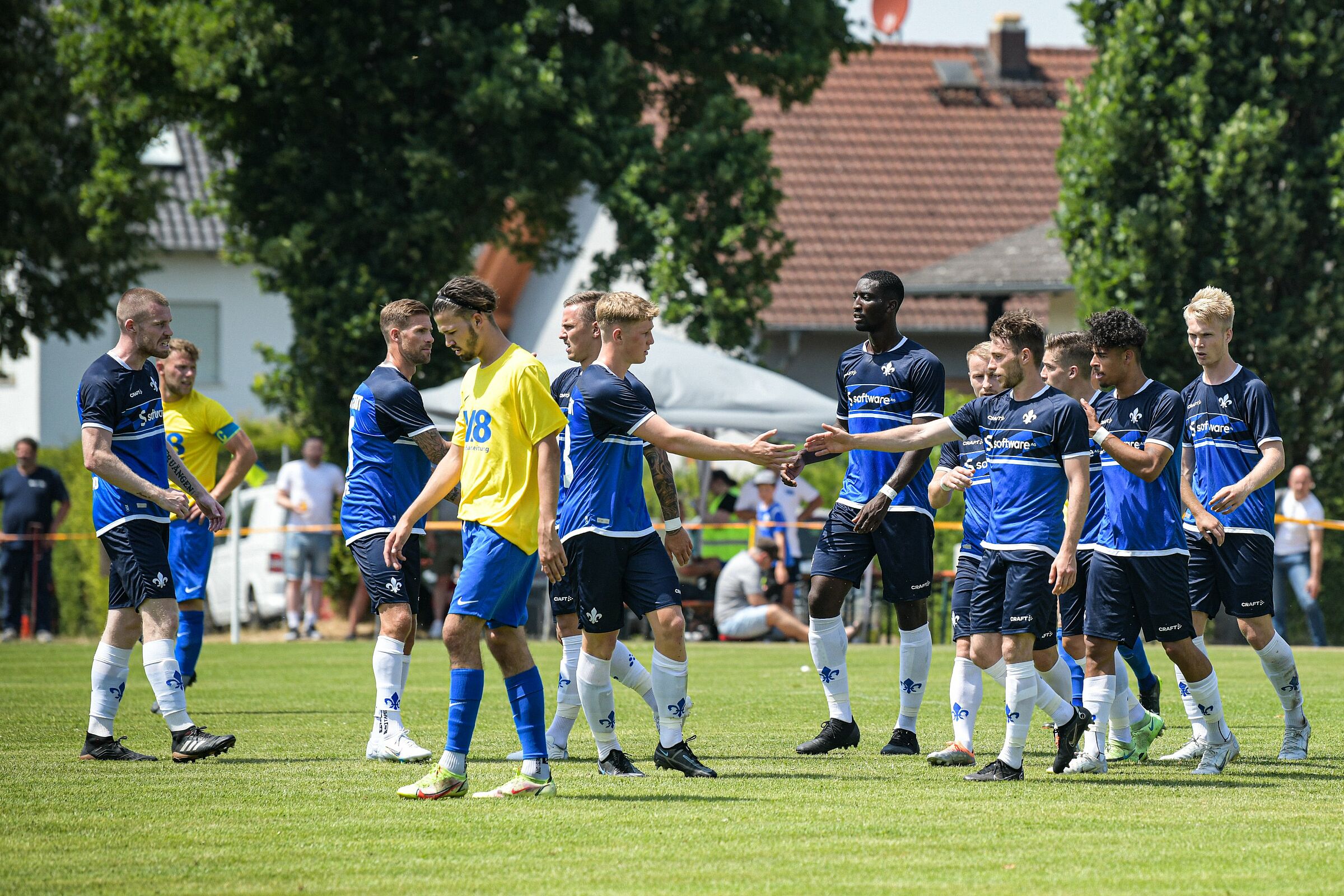 Bei hohen Temperaturen verzeichneten die Lilien von Beginn an viel Ballbesitz und gingen bereits in der zweiten Minute durch Andre Leipold in Führung. Der Mann der ersten Halbzeit hieß allerdings Matthias Bader, der einen lupenreinen Hattrick (10., 15. und 32. Minute) schnürte und dabei teils sehr sehenswerte Treffer erzielte. Die mutigen Gastgeber aus Langstadt/Babenhausen verkürzten wenig später durch Jannik Heßler auf 1:4, kurz vor dem Pausenpfiff stellte Phillip Tietz den alten Abstand wieder her.
