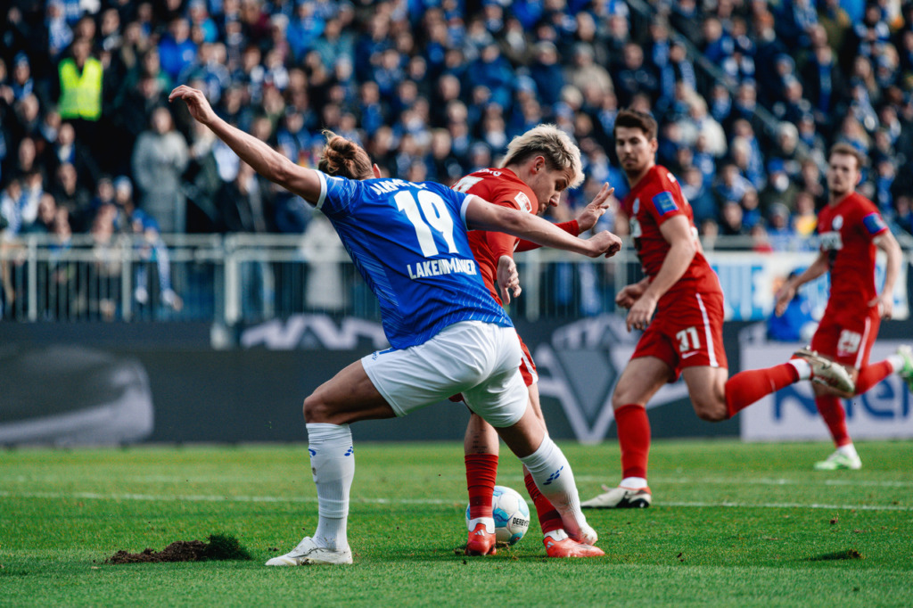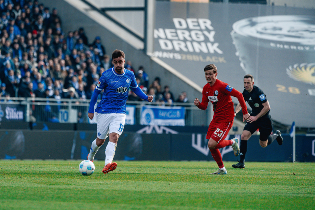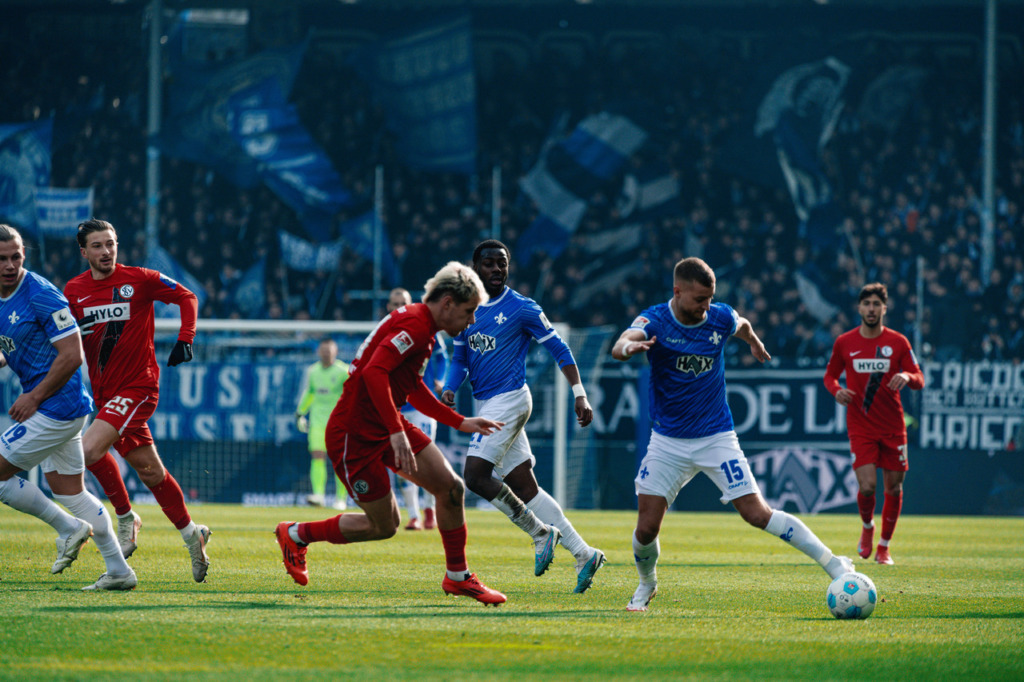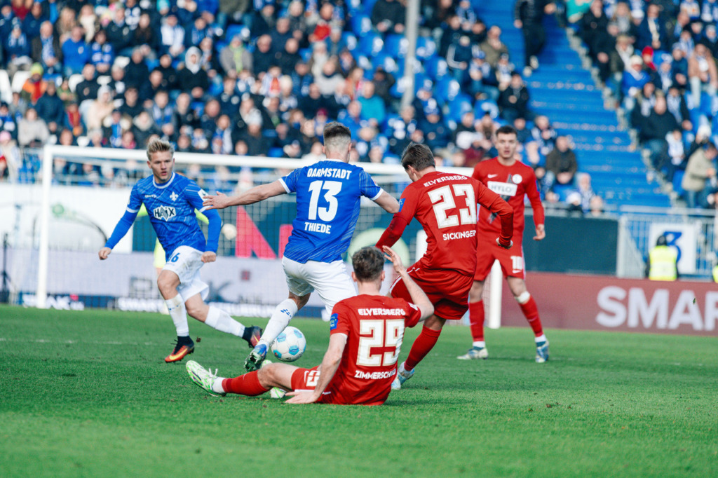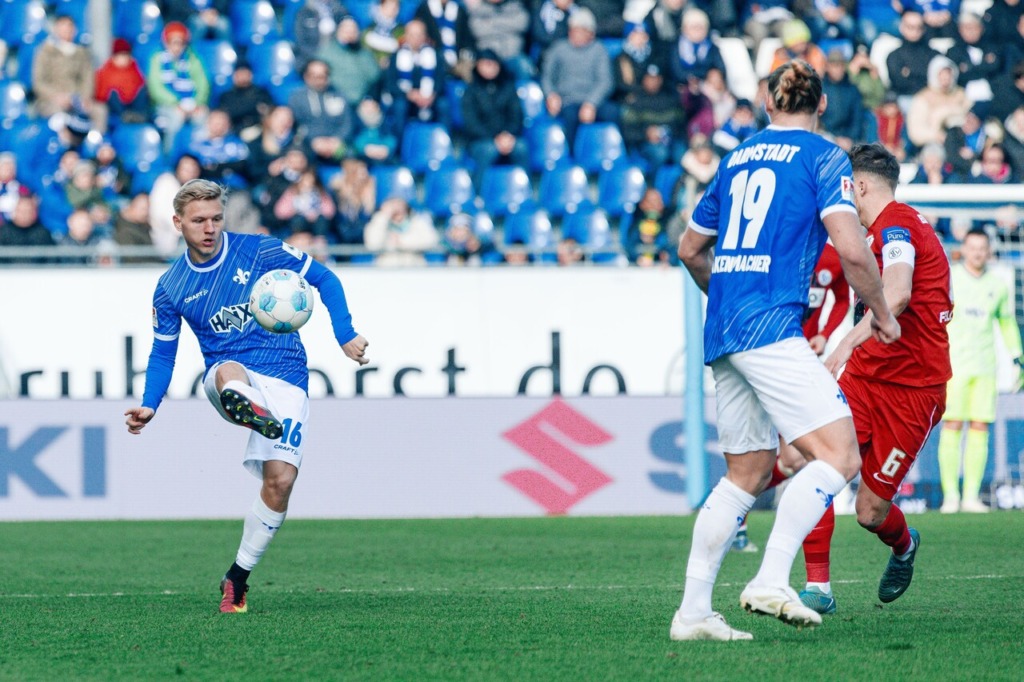 The opening minutes of the home game against SV Elversberg were initially fairly even, with slight advantages for the home team. Darmstadt recorded their first dangerous shot after eight minutes: Fynn Lakenmacher laid off for Killian Corredor and his shot went wide of the goal. However, the guests took the lead with their first opportunity: after a nice combination from the away side, the Lilies didn’t get the ball cleared and Fellhauer rifled the ball home from distance in the the 12th minute.