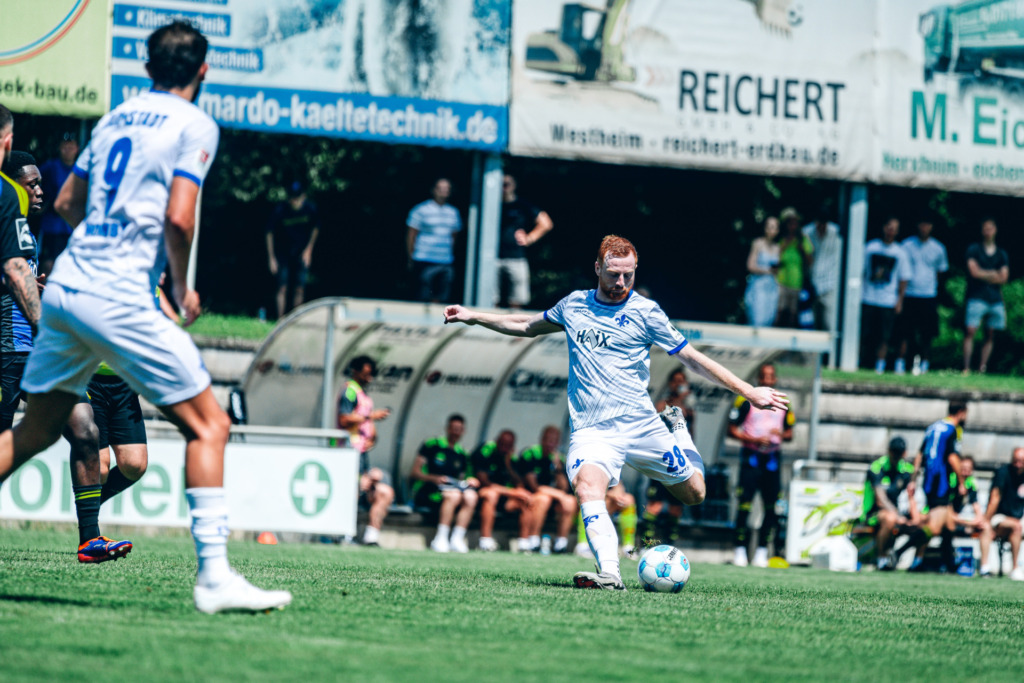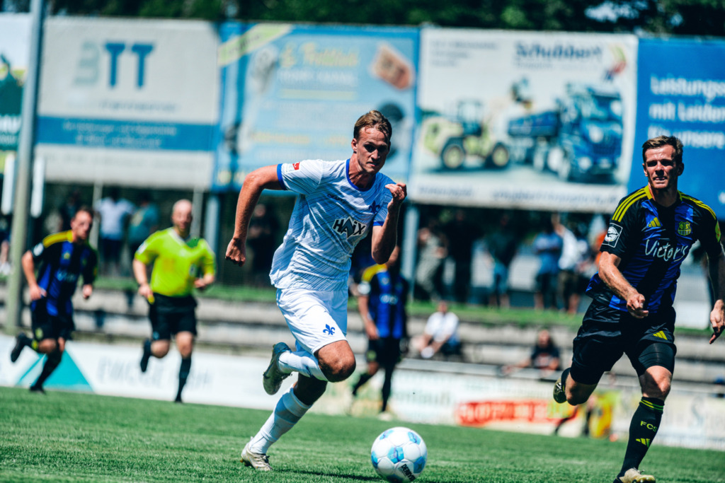 At temperatures of 30 degrees, an extremely entertaining encounter developed in the Viktoria stadium from Herxheim. After just a few seconds, Luca Marseiler backheeled a ball into the path of Oscar Vilhelmsson, but the Swede was denied by Saarbrücken keeper Phillip Menzel. In direct response, it was the Saarlanders who came dangerously in front of the box and were awarded a penalty after a foul by Klaus Gjasula on Julian Günther-Schmidt. Patrick Schmidt saw his spot kick saved by Marcel Schuhen, but used the follow-up shot to take the early FCS lead on 3 minutes.