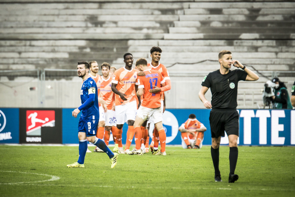 Pause. Rums. In der Kabine rappelte es. “Die Halbzeitansprache wurde etwas lauter”, verriet Kempe. Das musste auch so sein. Die Südhessen nutzten die Viertelstunde, um sich noch einmal einzuschwören und alle Sinne zu schärfen. Das gelang. “Wie schon gegen Nürnberg und Magdeburg lagen wir auch gegen den KSC wieder hinten. Doch wir haben nie an uns gezweifelt”, verdeutlichte Marvin Mehlem, der eine deutliche Leistungssteigerung seiner Mannschaft sah. Eine Mannschaft, die alle nötigen Tugenden auf den Platz brachte, die es in der 2. Bundesliga braucht, um ein Spiel zu gewinnen. Kampf, der unbedingte Wille und Effektivität. Und dazu noch guter Fußball. Das sah beim letzten Aufgalopp in Karlsruhe noch ganz anders aus. Sowohl das KSC-Spiel als auch der Auswärtsauftritt in Osnabrück zählten in der vergangenen Saison mit zu den schlechtesten Leistungen der gesamten Spielzeit 2019/2020. Die Entwicklung der Mannschaft ist deutlich erkennbar. “Das zeigt die Moral des Teams”, lobte Kempe und fügte an: “Hut ab davor, wie wir in der zweiten Halbzeit gekämpft und nie aufgegeben haben. Wir haben immer weiter Gas gegeben, einer für den anderen.”
