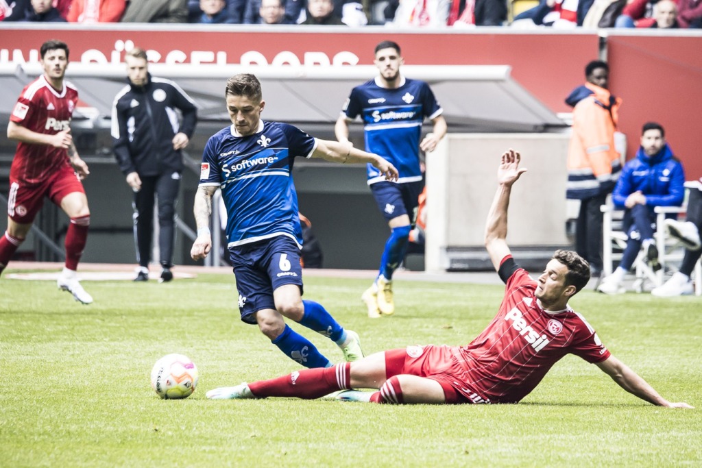Die Lilien begannen das Auswärtsspiel bei Fortuna Düsseldorf dominant und erspielten sich in den ersten zehn Minuten ein klares Übergewicht beim Ballbesitz. Die Darmstädter kamen zwar zu einigen Offensivaktionen, richtig gefährlich wurden diese aber nicht. Die Fortuna blieb offensiv bis auf eine Szene in der gesamten ersten Hälfte blass – diese hatte es aber in sich: Nach einem Freistoß scheiterte zunächst Klarer aus kurzer Distanz an Schuhen und dann wehrte der Schlussmann auch den Nachschuss von Kownacki ab (12.). Drei Minuten später kam Phillip Tietz auf der Gegenseite zum Abschluss, sein Versuch wurde aber geblockt und trudelte zur Ecke.