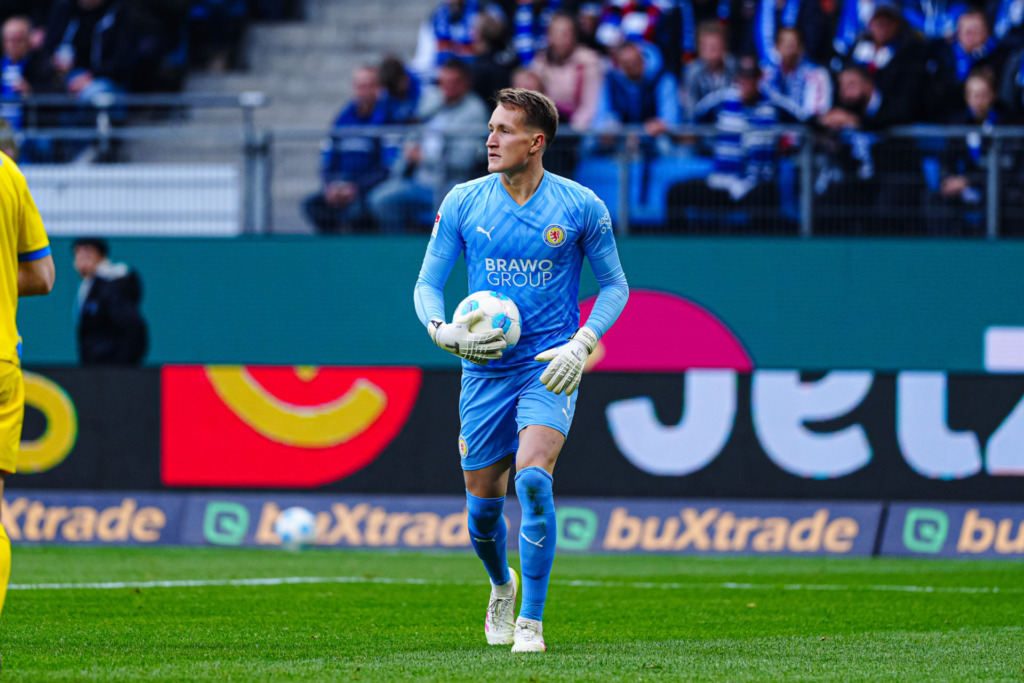At the end of the 2021/22 summer transfer window, his contract with FC Bayern Munich was extended until June 2023. This was accompanied by a loan move to the then English third division club AFC Sunderland until the end of the 2021/22 season. There he contributed 23 league appearances to the team’s promotion to the EFL Championship. But then came the first setback in Hoffmann’s career. After a Covid-19 infection, health complications arose that forced him to take a long break and return to Munich. Although he had impressed on the pitch, his illness prevented him from finishing the season. For the 2022/23 season, the Rostock native did not stay in the Bavarian capital, but moved permanently to second division club Eintracht Braunschweig. Hoffmann immediately felt at home there: in his initial two years with the Lions, he made a total of 45 league appearances as the regular goalkeeper. After his contract expired in 2024, Hoffmann sought a new sporting challenge. However, his new role at Schalke 04 did not go as he had hoped. Hoffmann describes his difficult time at Schalke as an instructive one: „Sporting-wise, things didn’t turn out the way I had hoped, but I learned an incredible amount as a person.“ In January 2025, he returned to the „Lions,“ initially on loan, where he played a major role in their dramatic battle against relegation. In May, the 26-year-old was finally able to wear the goalkeeper jersey for the Lower Saxony club again, signing a permanent contract with BTSV. „I’m really happy now that I can start playing with the lion on my chest again,“ he laughs happily into the camera.