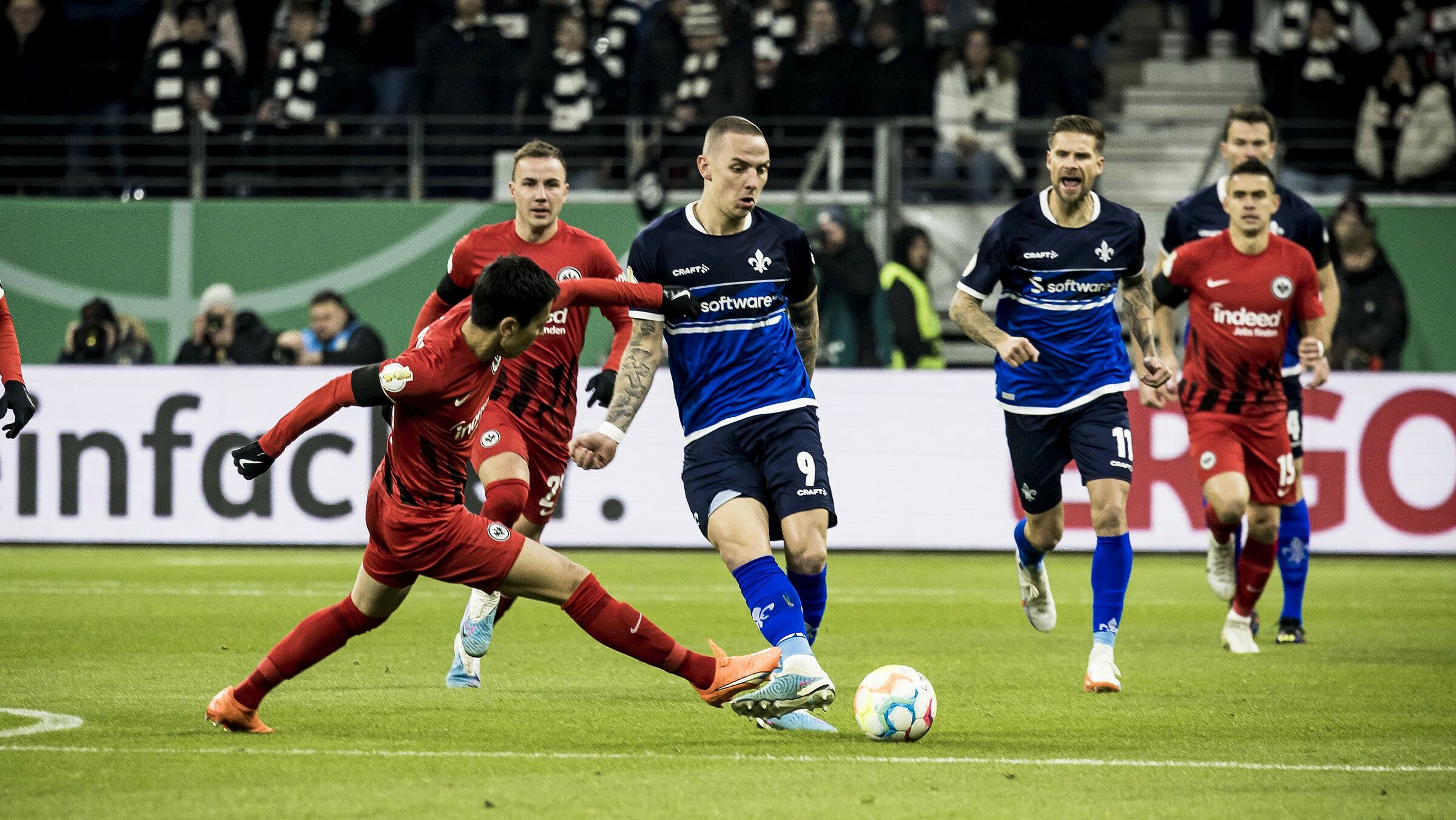 Im Achtelfinale des DFB-Pokals versteckten die Lilien nicht und waren in den ersten Minuten direkt präsent. Bereits nach fünf Minuten hatte Mathias Honsak die erste gute Gelegenheit, doch er verpasste die Hereingabe von Marvin Mehlem knapp. Auf der anderen Seite gingen dann aber die Gastgeber mit der ersten Offensivaktion in Führung: Kolo Muani traf per Kopfball (6.).