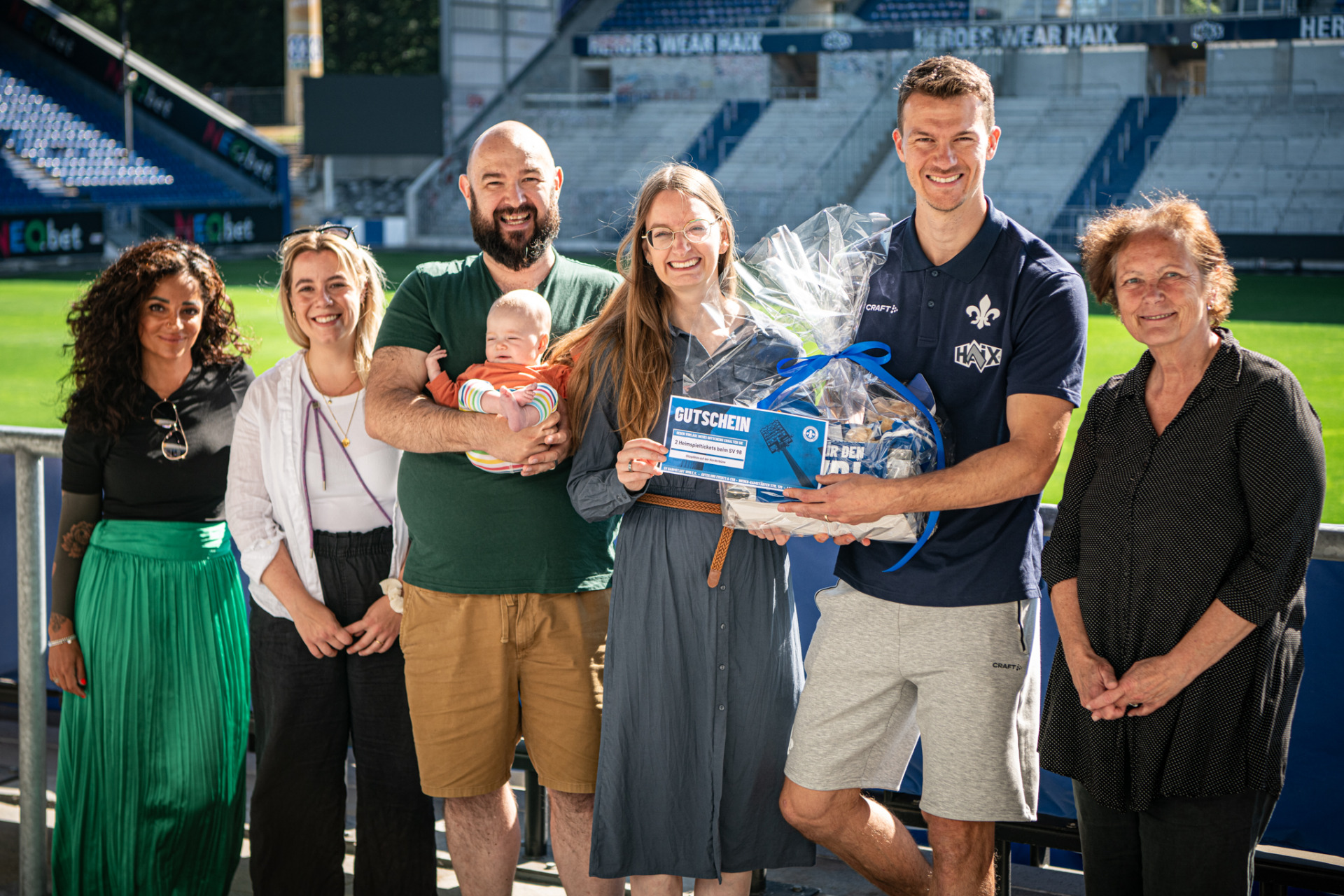 The family previously received a video greeting from SV98 player Clemens Riedel, who congratulated them on the birth. The sports club also invited the family to the Merck Stadium at the Böllenfalltor. They received a private tour, an honuor and a gift presented by Christoph Zimmermann. This ceremony was accompanied by Mayor Barbara Akdeniz, Nadia Alwan-Häfner, the head of the municipal social service department in the youth welfare office of the science city of Darmstadt, and Leonie Bothe, the specialist service employee.