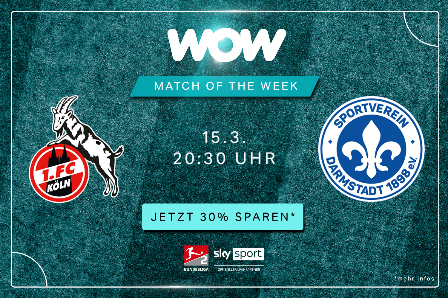 Kickoff for Saturday night's top match in the 2nd Bundesliga! Will the Lilies secure an away win in Köln? Stream the "WOW Match of the Week" between 1. FC Köln and SV Darmstadt 98 live on Saturday (March 15, 8:30pm) with WOW.